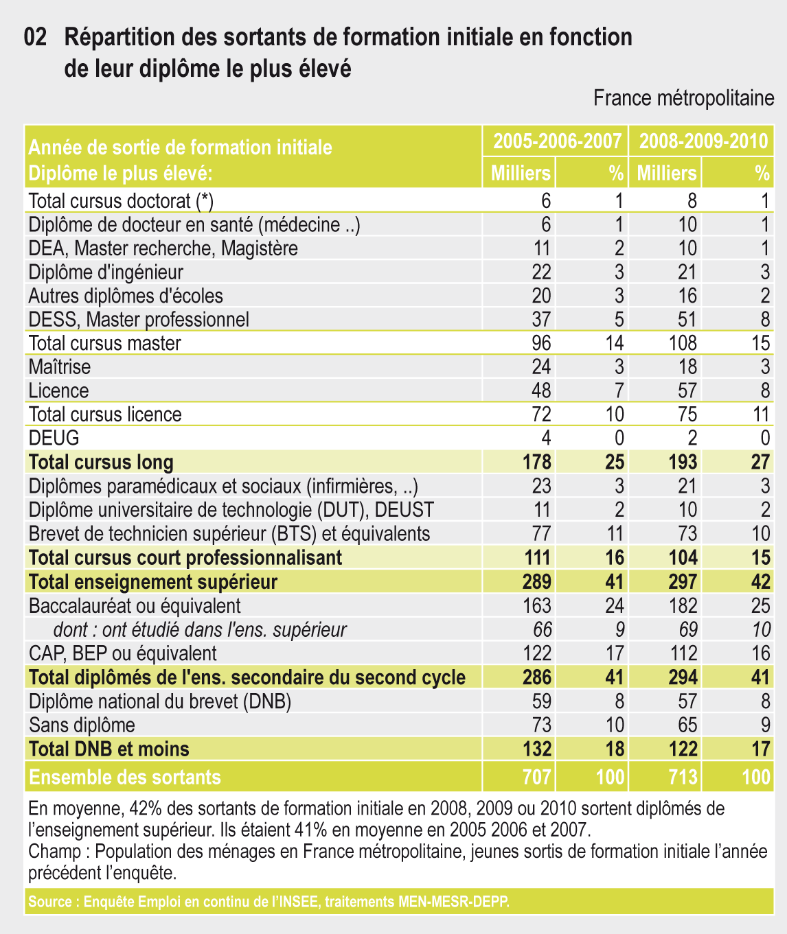 En moyenne, 42 % des sortants de formation initiale en 2008, 2009 ou 2010 sortent diplômés de l'enseignement supérieur. Ils étaient 41 % en moyenne en 2005 2006 et 2007 .