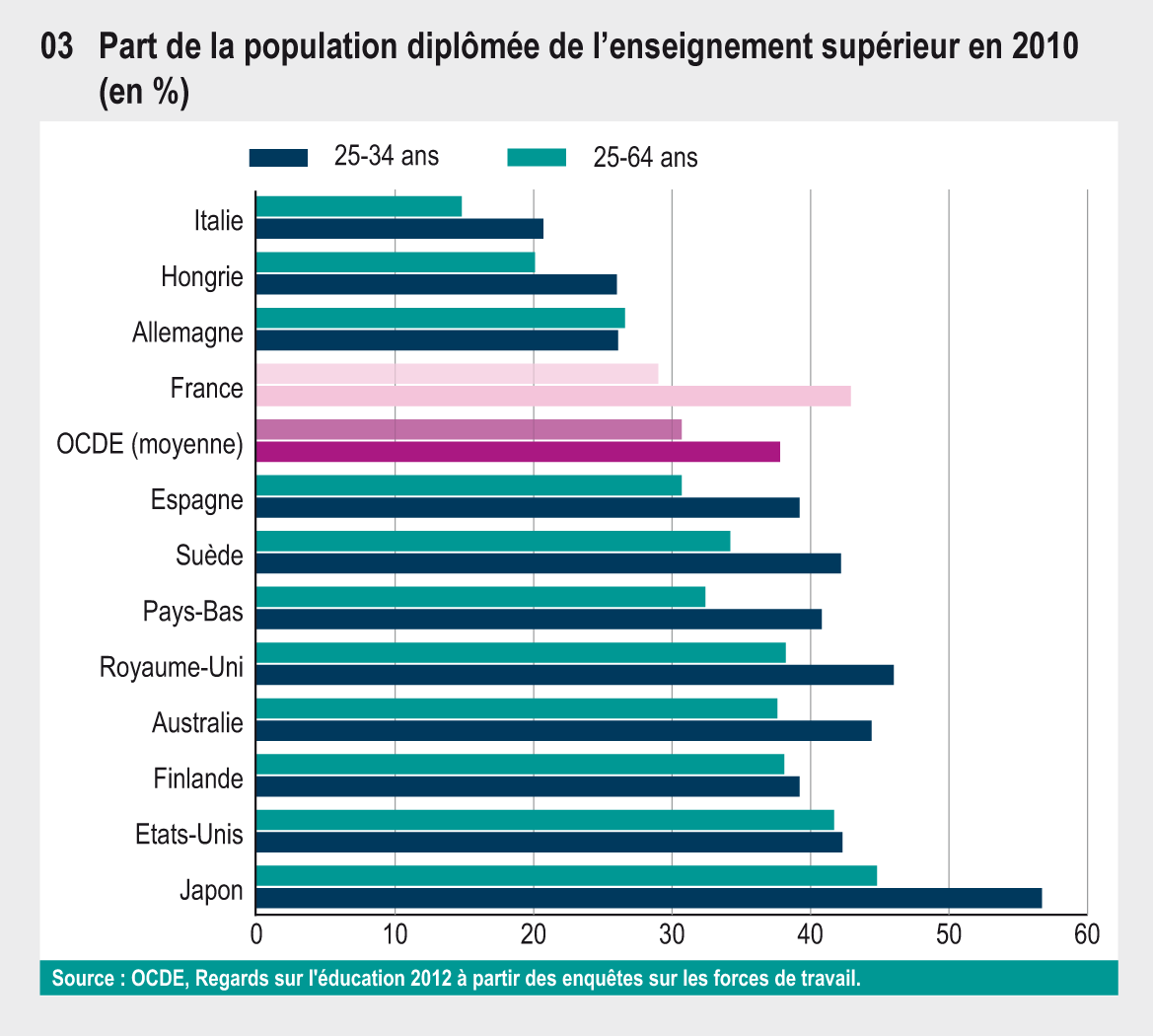 En France, les jeunes sont plus souvent diplômés de l’enseignement supérieur que les personnes plus âgées et plus souvent aussi que les jeunes vivant dans les autres pays de l’OCDE. À la fin des années 2000, 42 % des jeunes sortants de formation initiale sont diplômés de l’enseignement supérieur. Mais chaque année, environ 69 000 jeunes sortent de l’enseignement supérieur sans diplôme.