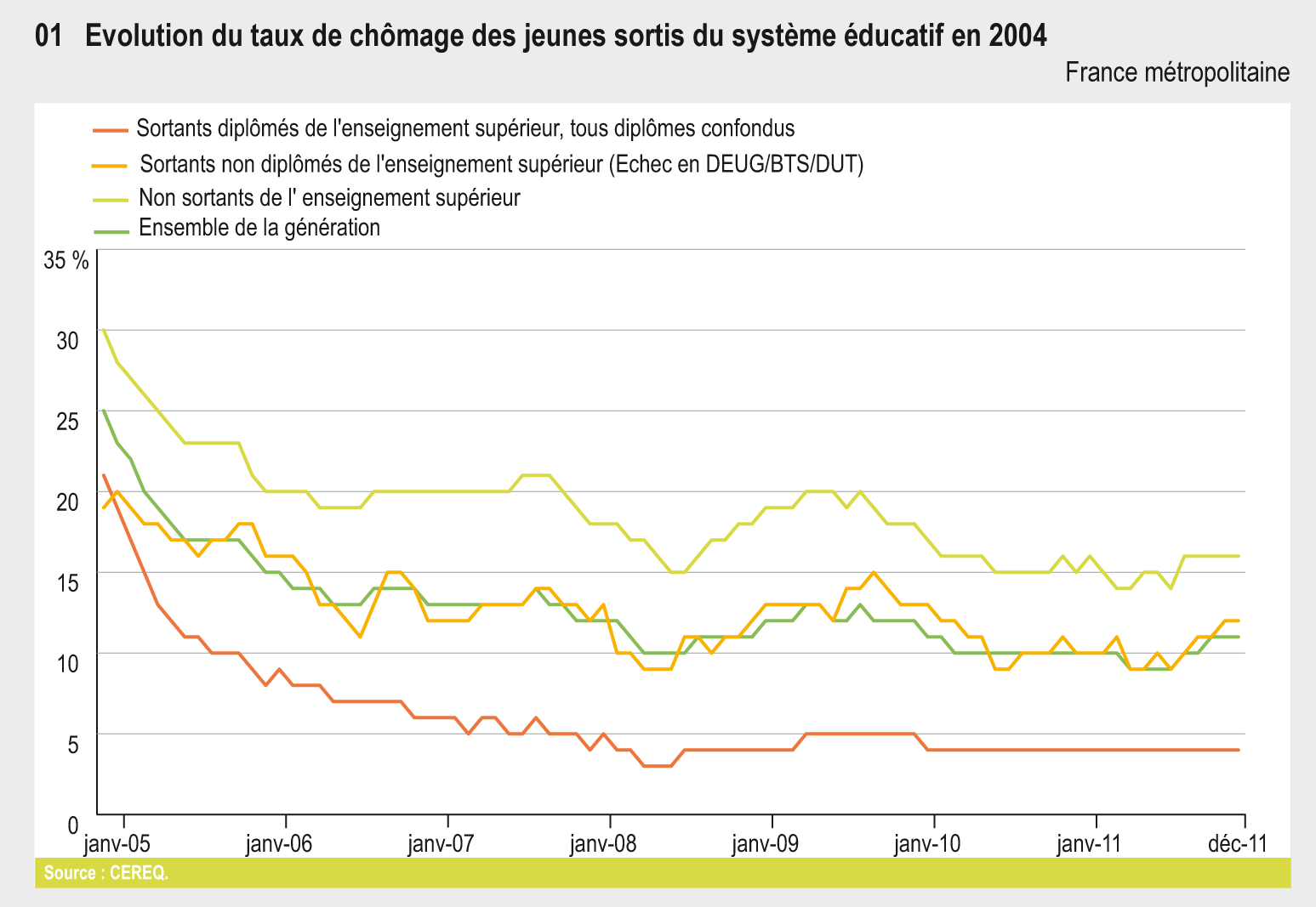 En 2011, 5 % des jeunes sortis de l’enseignement supérieur en 2004 sont au chômage alors que le taux de chômage des jeunes sortis du système éducatif en 2004 atteints 11 % en 2011. Mais, au sein de l’enseignement supérieur, les conditions d’insertion sur le marché du travail restent hétérogènes : avantage aux diplômés des écoles de commerce et d’ingénieurs et aux titulaires de diplômes universitaires à visée professionnelle.