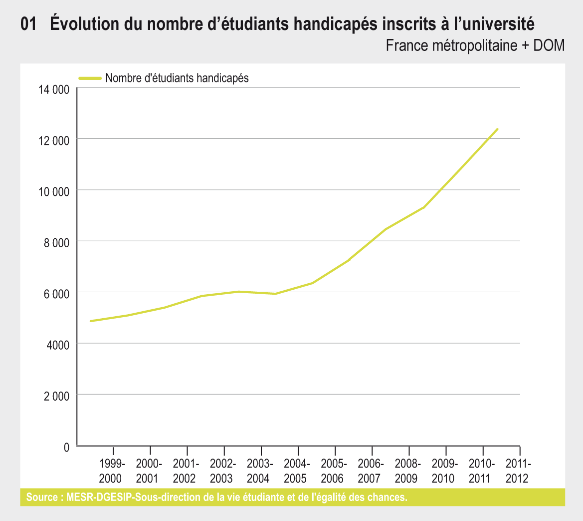En 2011-2012, près de 12 400 étudiants des universités françaises se déclarent handicapés. Leur nombre a doublé ces 5 dernières années. Ils se concentrent en L1 et leur présence décline au fil des cursus. Deux sur trois bénéficient d’un suivi spécifique.