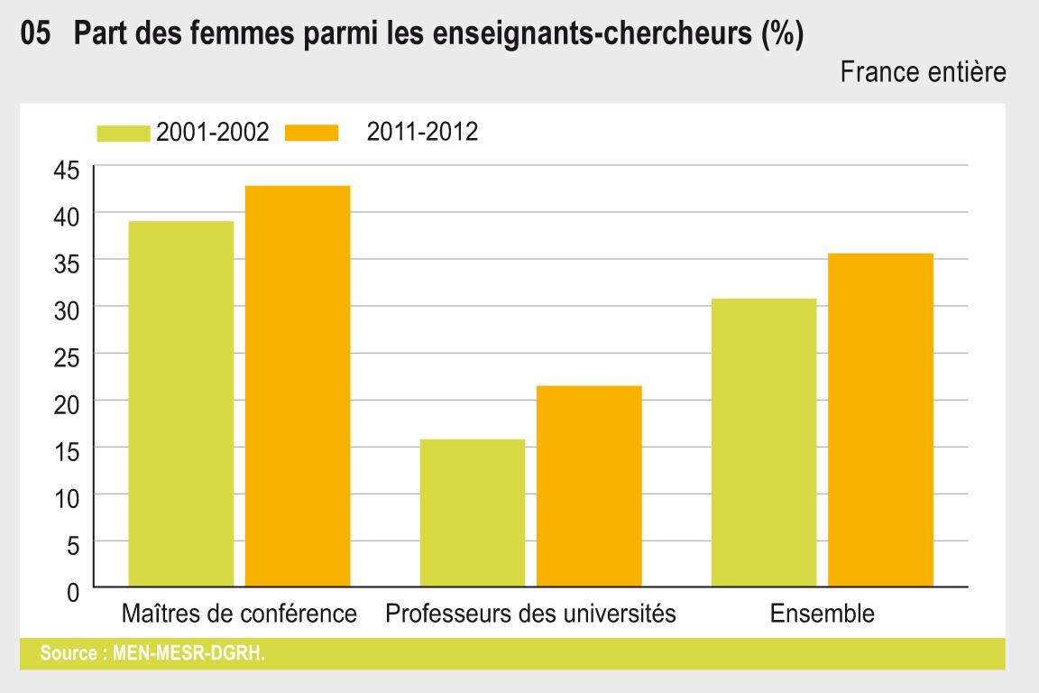 Cette fiche a été actualisée. Consultez la fiche 13. la parité dans l’enseignement supérieur dans L'état de l'Enseignement supérieur et de la Recherche en France n°10 - Avril 2017