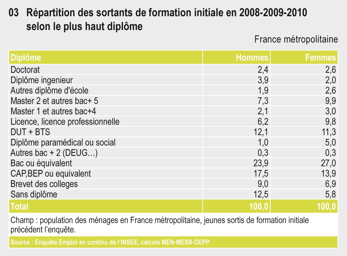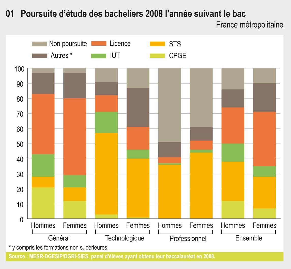 Ainsi, en 2008, 90 % des bachelières ont poursuivi leurs études après le bac contre 86 % des garçons. Elles n’ont pas choisi les mêmes filières : 35 % d’entre elles contre 50 % des garçons ont choisi une filière sélective (CPGE, IUT, BTS). À l’université, elles s’inscrivent deux à trois fois plus souvent en lettres, arts, langues ou sciences humaines.