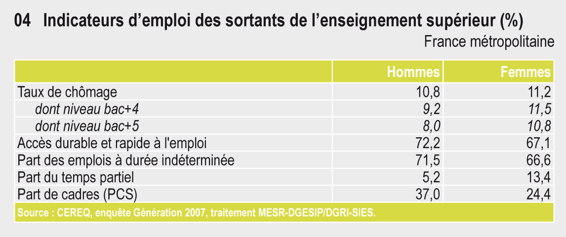 Les femmes, plus nombreuses que les hommes dans l’enseignement supérieur (56 %), s’inscrivent moins souvent dans les filières sélectives ou scientifiques à l’exception des formations en santé. Leur taux de chômage trois ans après leur sortie est peu supérieur à celui des hommes, mais leurs conditions d’emploi sont moins favorables. Depuis 10 ans, la part des femmes enseignants-chercheurs dans le supérieur progresse : elles représentent 35 % d’entre eux, mais encore seulement 20% des professeurs des universités.