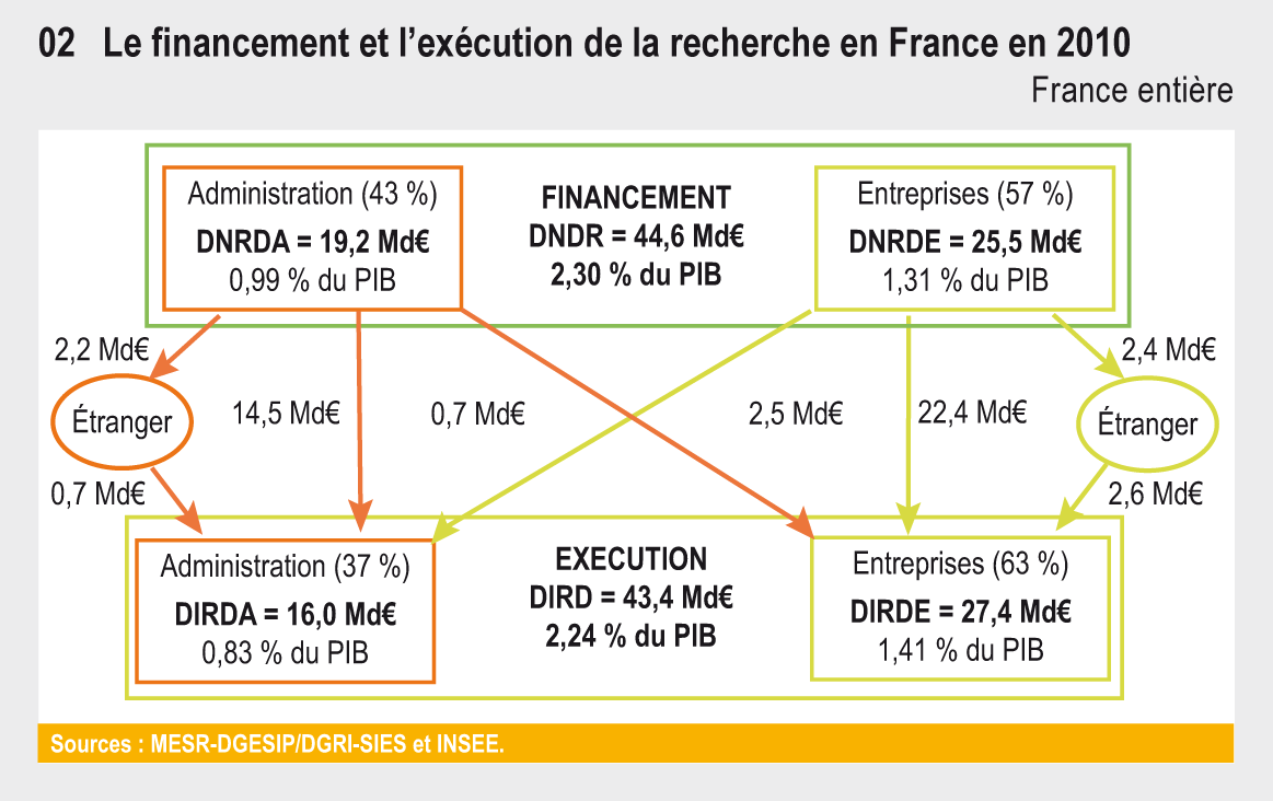 En 2010, la DIRD s’élève à 43,4 Md€. L’effort de R&D mesuré par le ratio DIRD / PIB s’établit à 2,24 %. La recherche des administrations (DIRDA) représente 37 % de la DIRD nationale et la recherche des entreprises (DIRDE), 63 %. L’exécution de travaux de R&D en France au bénéfice de l’étranger représente 7,6 % de la DIRD nationale.