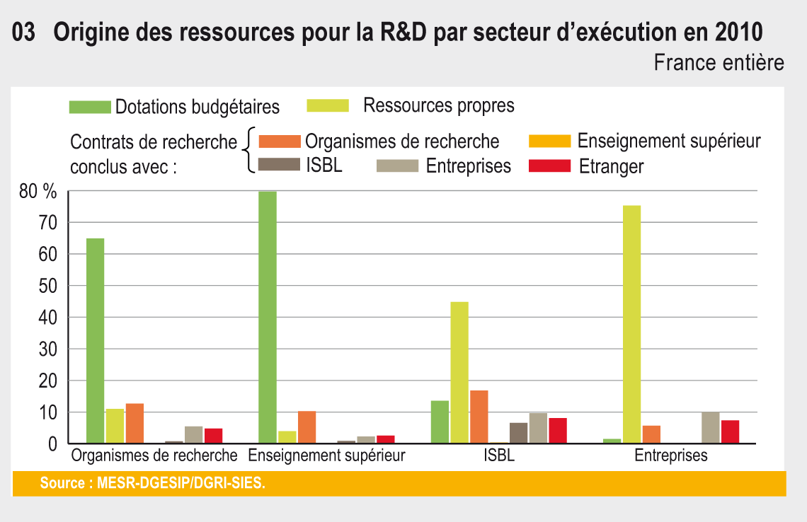 Les ressources consacrées à l’exécution des travaux de R&D proviennent, pour les entreprises à 75 % de ressources propres et pour les organismes publics de R&D, des crédits budgétaires à hauteur de 69 % (graphique 26.03).