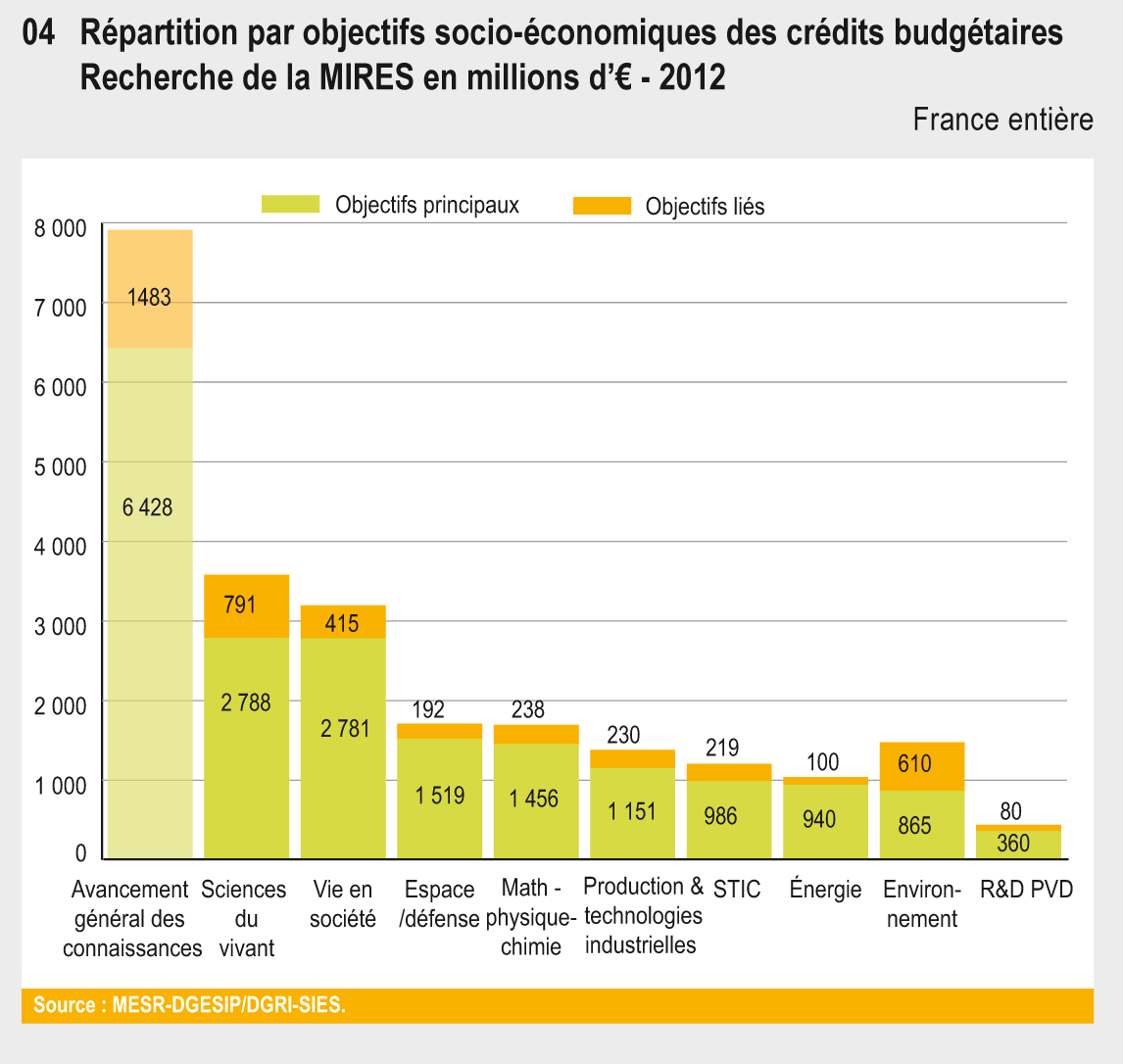 Cette fiche a été actualisée. Consultez la fiche 33. les objectifs socio-économiques des crédits budgétaires consacrés à la recherche dans L'état de l'Enseignement supérieur et de la Recherche en France n°10 - Avril 2017
