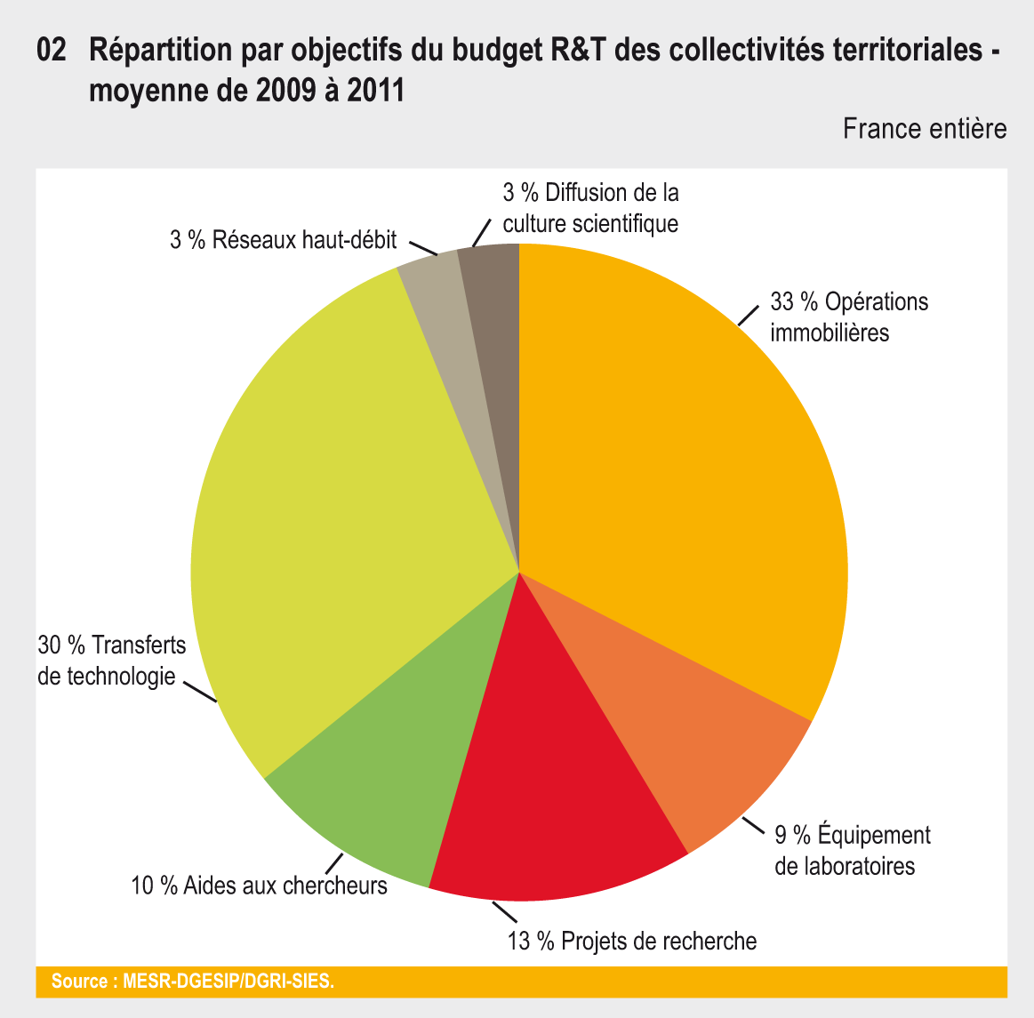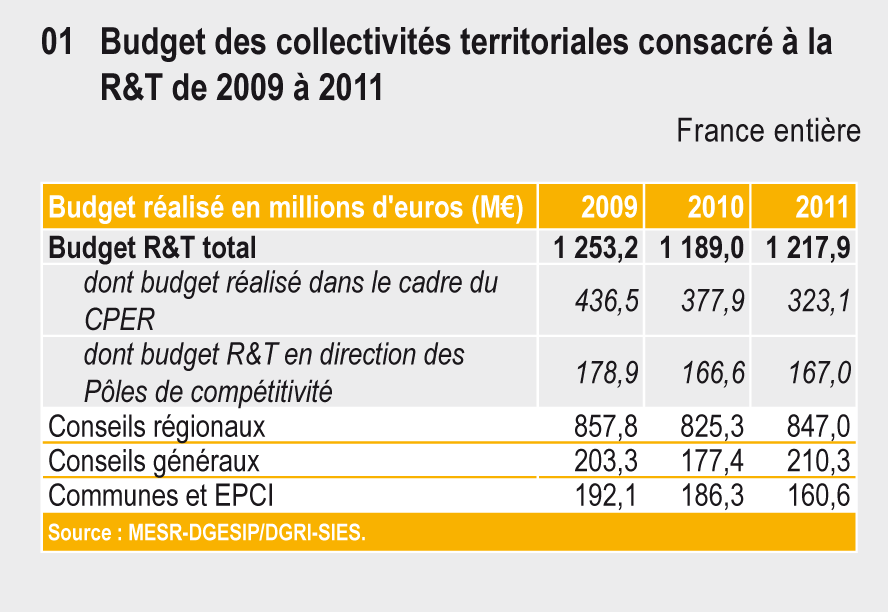 En 2011, les collectivités territoriales consacrent 1,2 milliard d’euros au financement de la recherche et du transfert de technologie, dont 27 % s’inscrit dans les contrats de projet État-Région. La part des conseils régionaux est de 70 %. Ces financements concernent en premier lieu des opérations immobilières et des transferts de technologie.