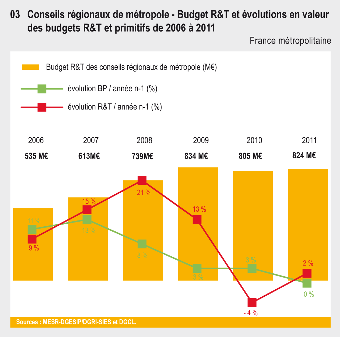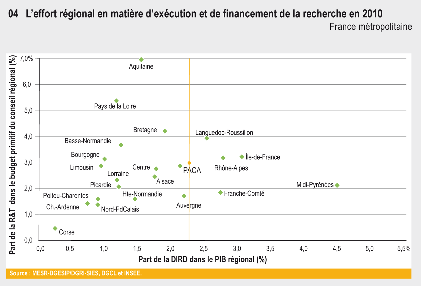 En 2010, la DIRD de métropole représente 2,3 % de son PIB et le budget R&T de l’ensemble des conseils régionaux de métropole représente 3,0 % de leur budget primitif. En 2010, sur les vingt-deux régions de métropole, trois d’entre elles réalisent un effort relatif plus important que la moyenne métropolitaine à la fois en termes de financement de la R&T et en termes d’exécution de la R&D par les entreprises et les administrations (Ile-de-France, Rhône-Alpes et Languedoc-Roussillon). Inversement, douze régions se situent sous la moyenne métropolitaine pour les deux indicateurs.