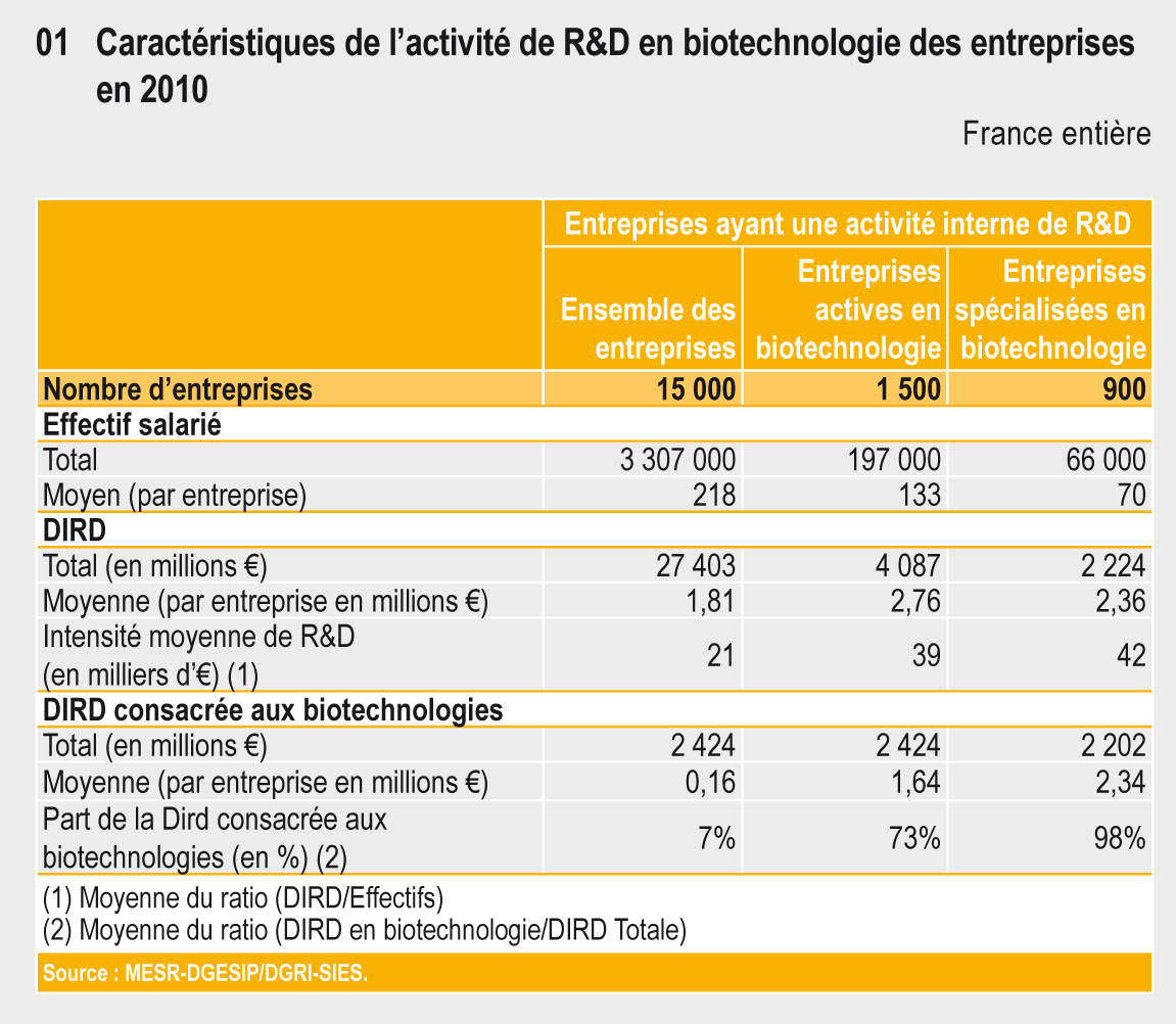 En 2010, les entreprises ont engagé 2,4 milliards d’euros pour réaliser des travaux de R&D en biotechnologie. Près de 9 % des dépenses de R&D engagées par les entreprises pour effectuer des travaux de R&D relèvent des biotechnologies. Cette activité est essentiellement réalisée dans des entreprises de petite taille.
