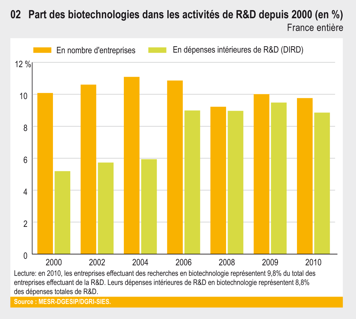 La dépense intérieure de R&D des entreprises (DIRDE) en biotechnologie s’élève à 2,7 milliards d’euros (Md€). Elle représente environ 9 % de la DIRDE, part stable depuis 2006. La proportion d’entreprises actives dans ce domaine d’activité progresse d’un point en un an pour atteindre 11 % en 2012. Les entreprises spécialisées en biotechnologie sont surtout des petites structures [Consult the following page]