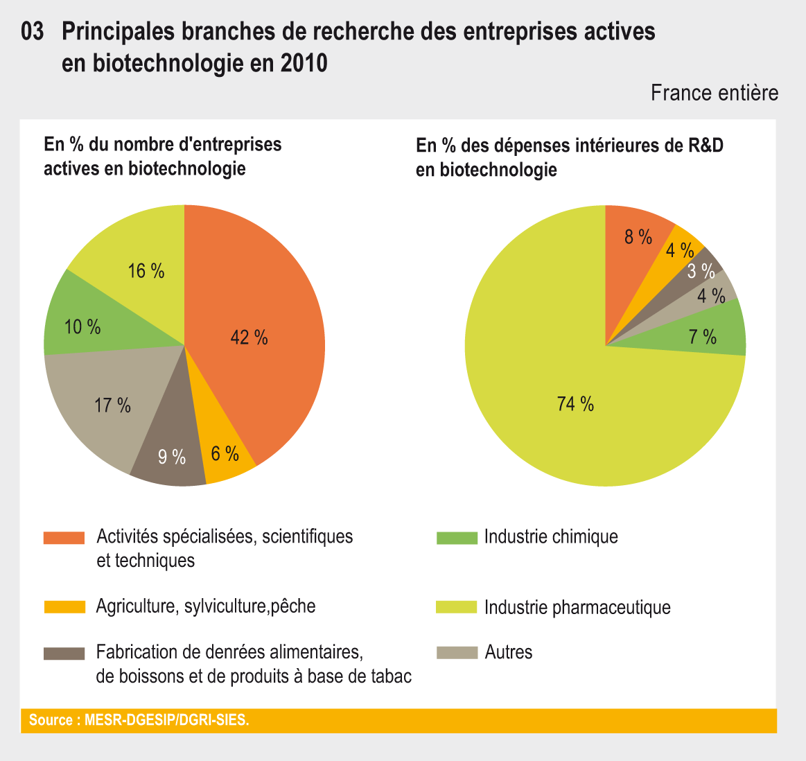 En 2010, les entreprises ont engagé 2,4 milliards d’euros pour réaliser des travaux de R&D en biotechnologie. Près de 9 % des dépenses de R&D engagées par les entreprises pour effectuer des travaux de R&D relèvent des biotechnologies. Cette activité est essentiellement réalisée dans des entreprises de petite taille.