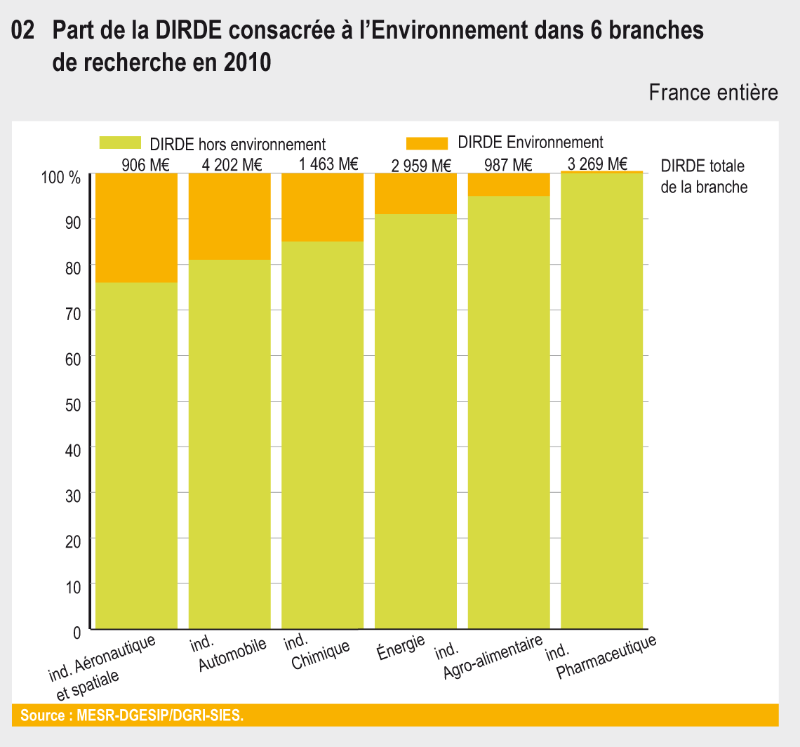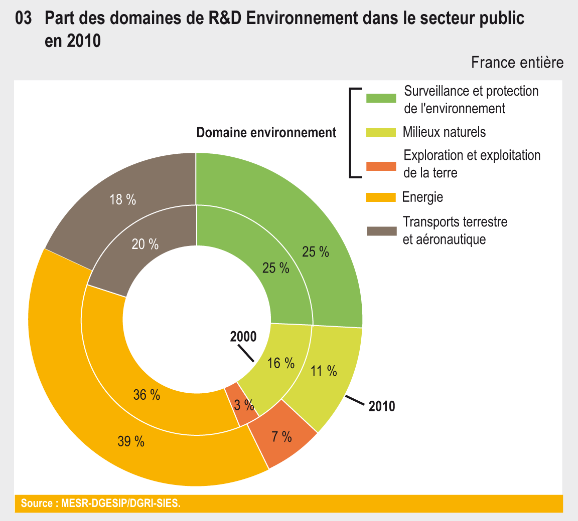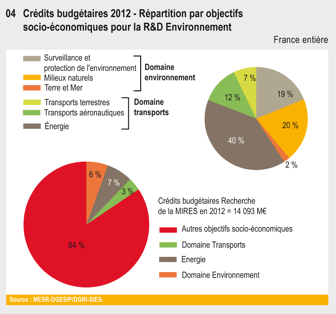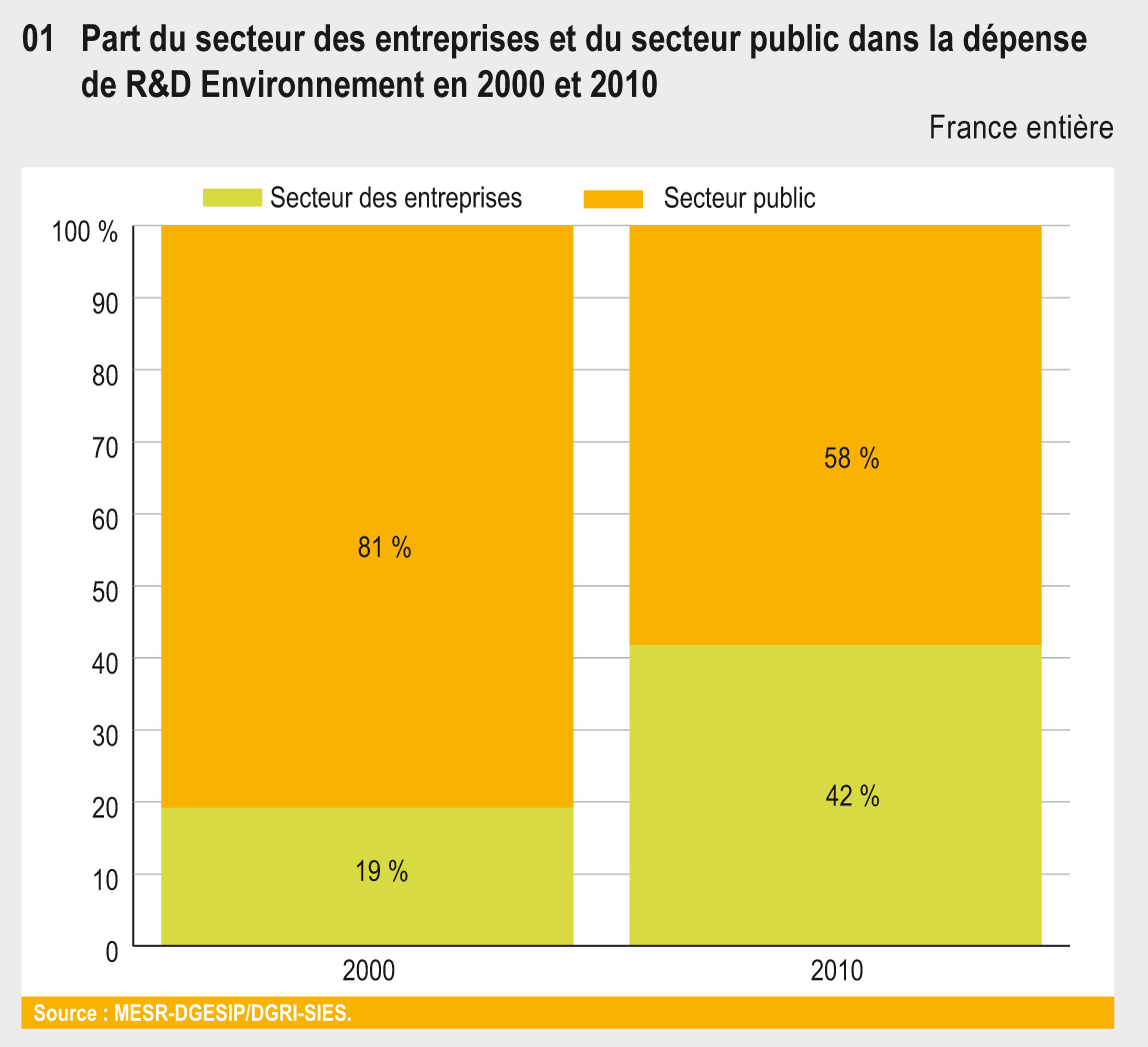 En 2012, les dépenses de R&D consacrées directement ou indirectement à l’environnement est évaluée à 5 milliards d’euros (Md€), soit 11 % de la dépense intérieure de R&D. Près de 60 % (contre 20 % en 2000) des dépenses de R&D en environnement (hors Énergie et Transports) sont pris en charge par les entreprises [Consult the following page]