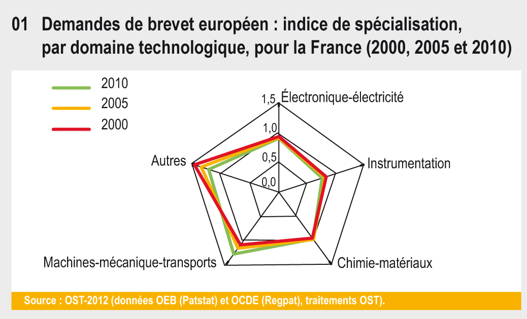 Dans le système européen de brevets, la France est, en 2010, spécialisée dans les domaines « machines-mécanique- transports » (indice de spécialisation de 1,28) et « autres » (indice de 1,23), catégorie qui comprend les biens de consommation et le BTP. Elle est sous-spécialisée en « instrumentation » (graphique 44.01). Entre 2005 et 2010, la France voit sa spécialisation diminuer de plus de 6 % dans les domaines « instrumentation » et « autres », tout en renforçant celle en « machines-mécanique-transports » de 10 %.