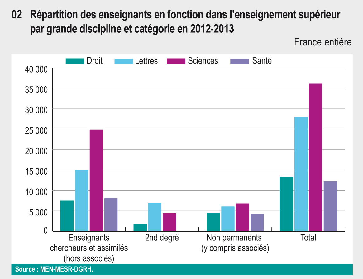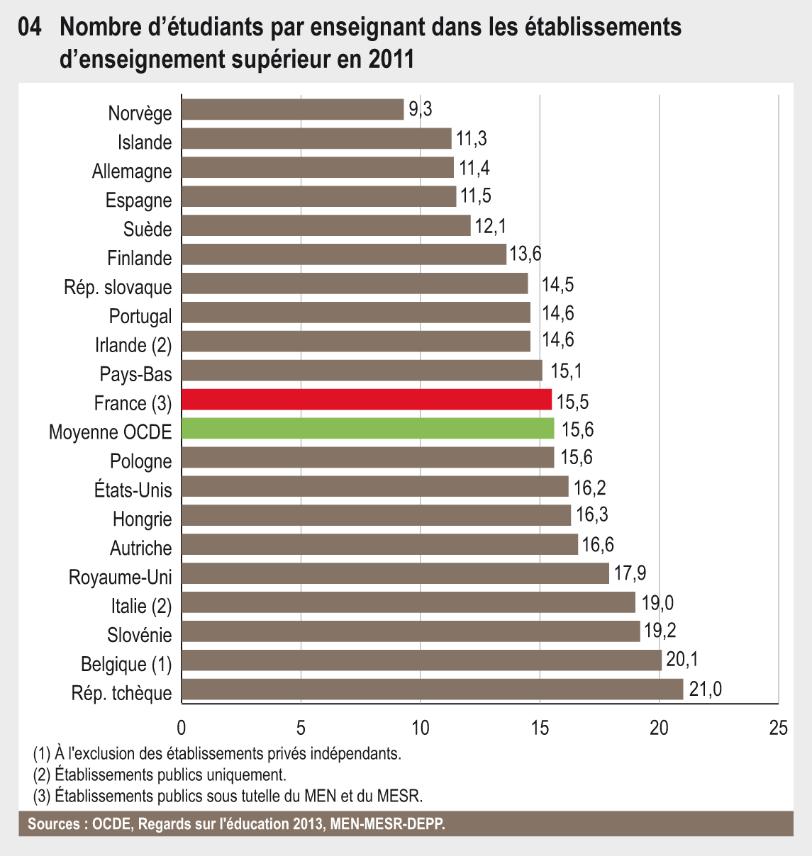 En 2012-2013, 91 300 enseignants exercent dans les établissements publics d’enseignement supérieur sous tutelle du MENESR, sur un total d’environ 125 000 personnes. La France compte 15,5 étudiants par enseignant, proche du taux d’encadrement constaté pour l’ensemble des pays de l’OCDE (15,6). Le quart de ces personnels est affecté en Île-de-France.