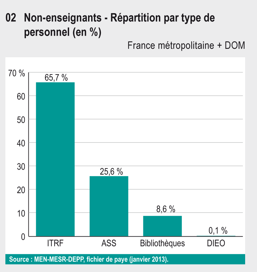 En 2012-2013, environ 125 000 personnes exercent dans les établissements publics de l’enseignement supérieur et de la recherche (hors EPST) sous tutelle MENESR. 53 000 non-enseignants assurent des fonctions administratives, techniques ou d’encadrement.