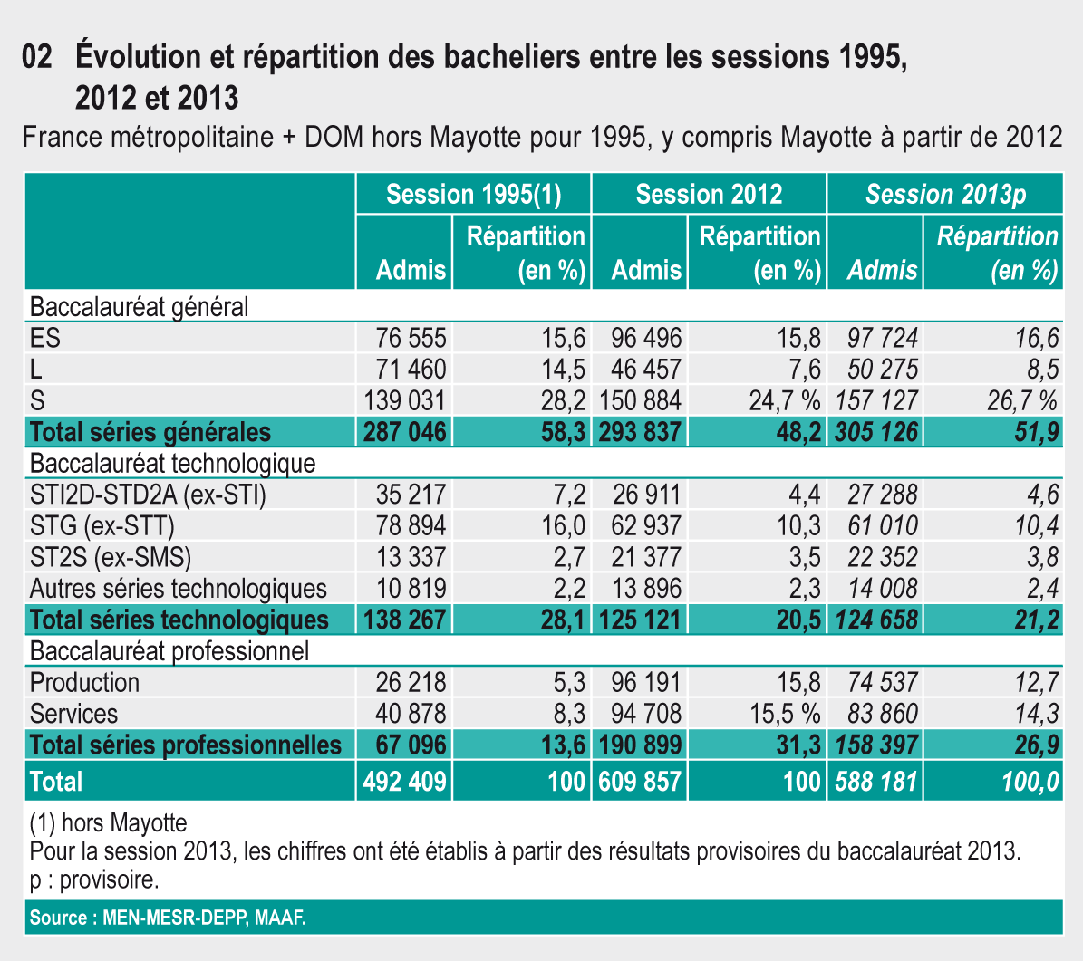 Entre 1995 et 2012, il a augmenté de près de 10 points (hors Mayotte) : + 14,6 points dans le général, + 8 points dans le technologique et + 5,8 points dans le professionnel. Selon les résultats provisoires de 2013, 305 000 candidats ont obtenu un baccalauréat général, 125 000 un baccalauréat technologique et 158 000 un baccalauréat professionnel. C’est près de 30 000 de moins qu’en 2012 dans cette dernière voie. Le taux de réussite global augmenterait de plus de 2 points par rapport à 2012, et atteindrait le niveau historique de 86,8 %. La réussite dans la voie professionnelle se stabiliserait après trois années consécutives de baisse.