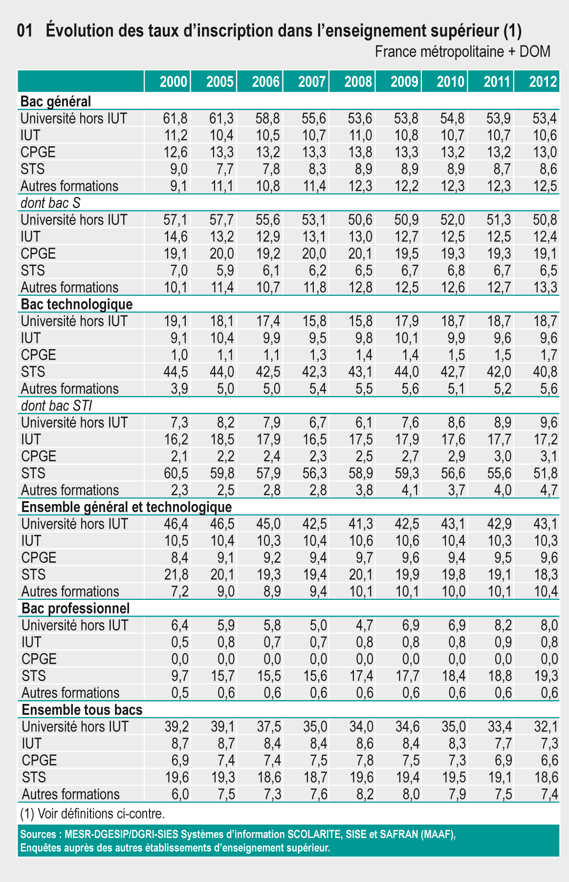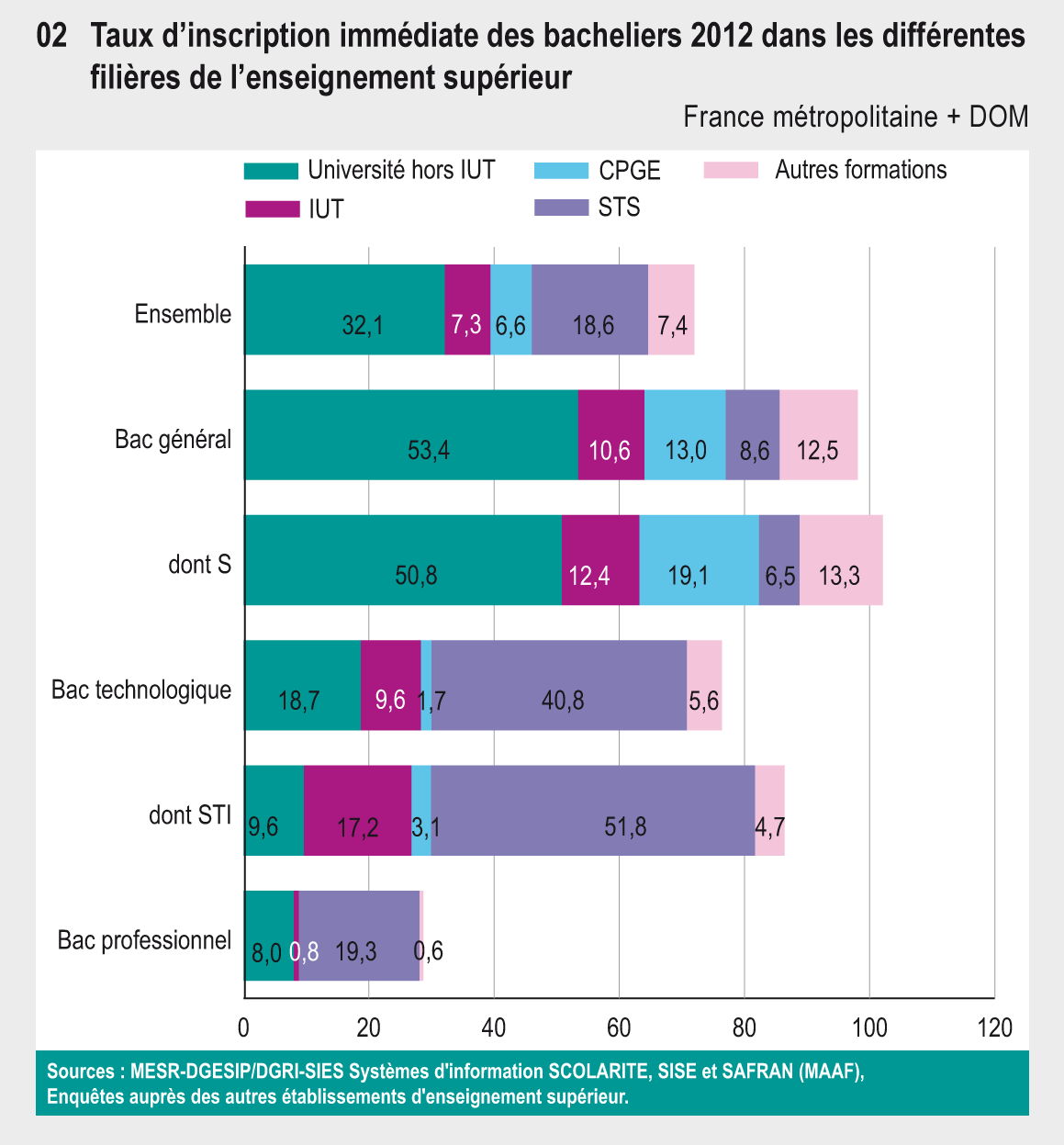 Environ 80 % des bacheliers 2012 s’inscrivent immédiatement dans l’enseignement supérieur, y compris en alternance. Plus de la moitié des bacheliers généraux s’inscrivent à l’université mais c’est près de 10 points de moins qu’en 2000. Plus d’un bachelier technologique sur deux s’inscrit dans une filière professionnelle courte. Les bacheliers professionnels dont les effectifs ont considérablement augmenté avec la réforme de la voie professionnelle sont de plus en plus nombreux à s’inscrire dans l’enseignement supérieur.