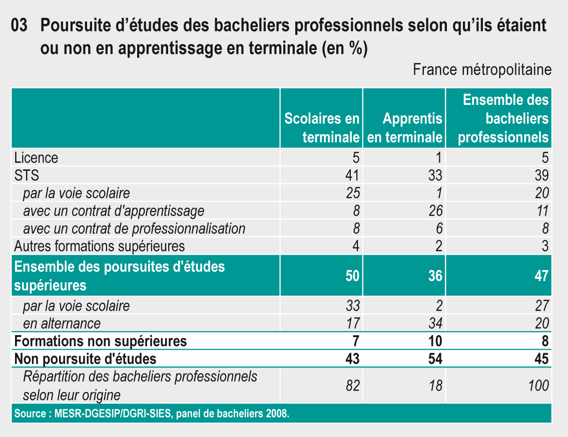 09.03 Poursuite d'études des bacheliers professionnels selon qu'ils étaient ou non en apprentissage en terminale (en %)