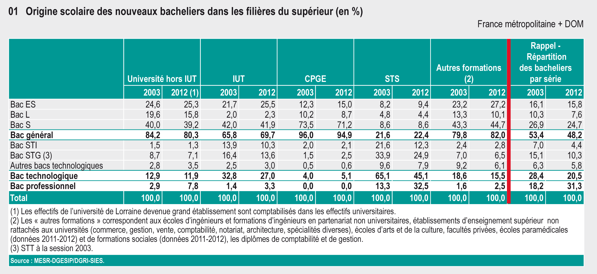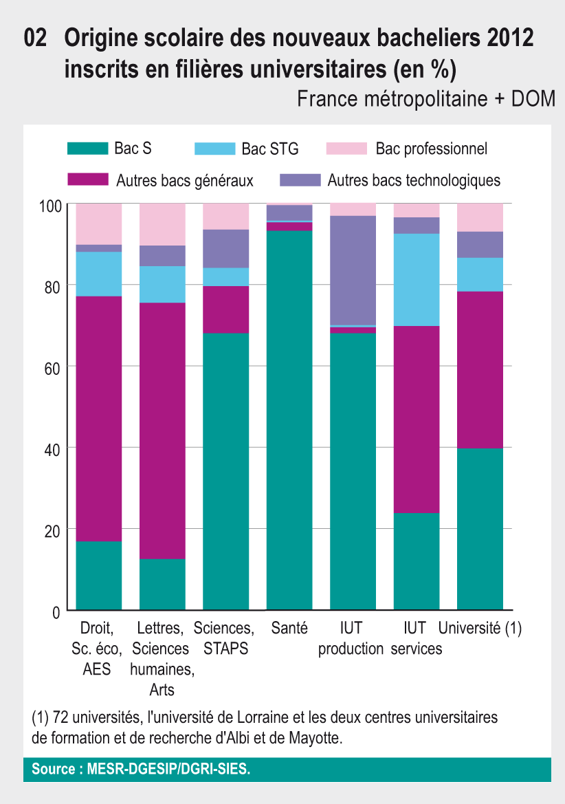 En 2012, les bacheliers généraux représentent 80,3 % des nouveaux bacheliers inscrits en université (hors IUT). Leur part dans les entrants en IUT a crû de 4 points depuis 2003 et atteint 69,7 % en 2012. Les STS recrutent encore principalement des bacheliers technologiques, mais leur part diminue à mesure que celle des bacheliers professionnels augmente.