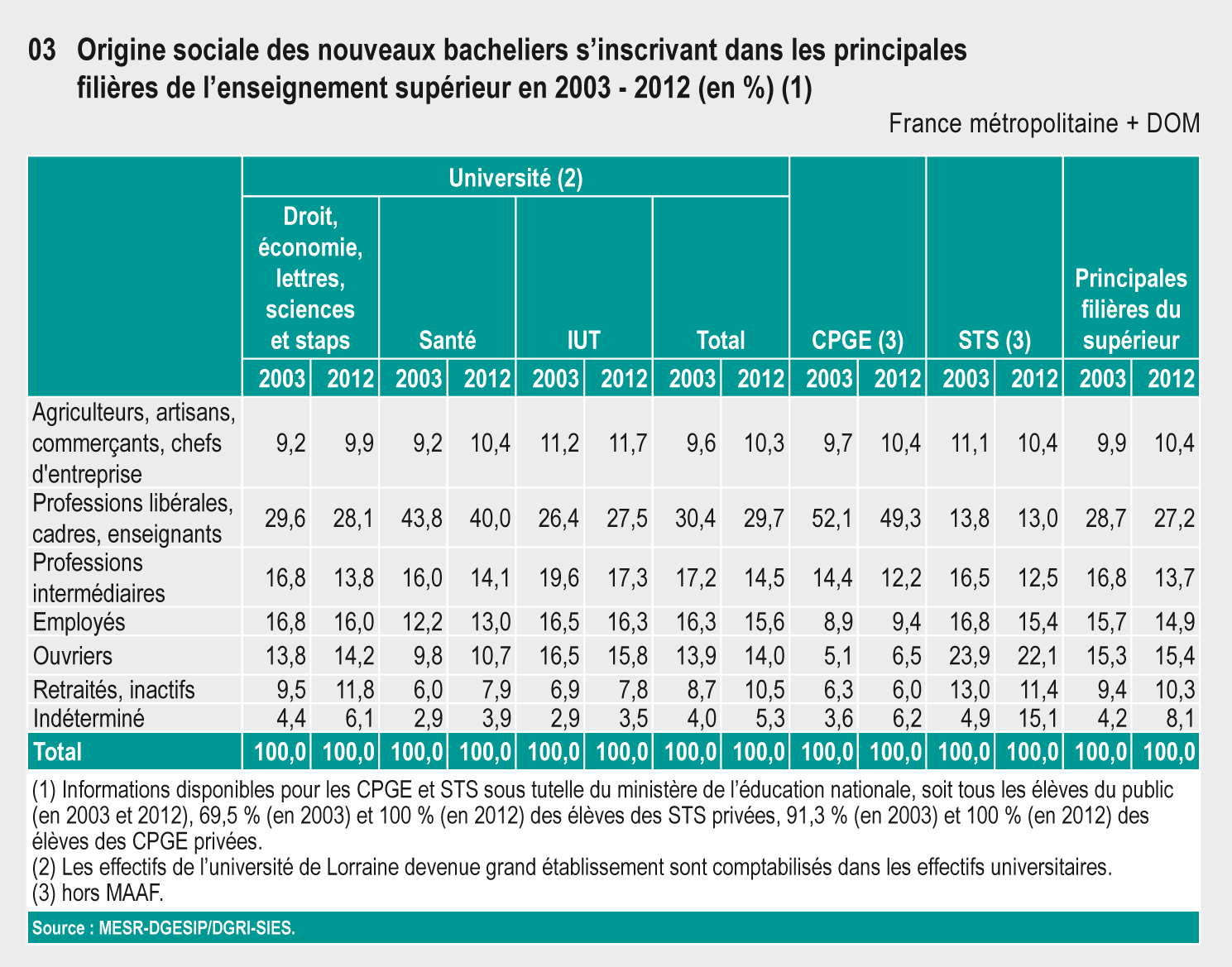 L’accès à l’enseignement supérieur reste fortement lié à l’origine sociale : parmi les bacheliers 2012 qui s’inscrivent immédiatement dans l’enseignement supérieur, les jeunes issus des catégories sociales les plus favorisées sont surreprésentés. 27,2 % ont des parents cadres supérieurs, enseignants ou exerçant une profession libérale, contre 22,3 % sur l’ensemble des bacheliers. En 2012, comme en 2003, les enfants de cadres sont proportionnellement deux fois plus nombreux que les enfants d’ouvriers dans les principales filières de l’enseignement supérieur (tableau 10.03).