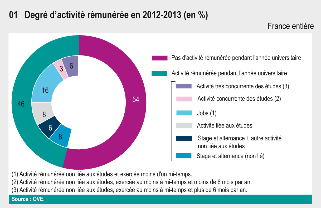 En 2010, sept étudiants sur dix ont exercé une activité rémunérée. Si 20 % des étudiants réservent cette activité à la période estivale, 50 % connaissent une période d’activité rémunérée en cours d’année universitaire. La part des étudiants exerçant une activité rémunérée liée à leurs études atteint 14 % en 2010, en progression de 5 points par rapport à 200 [Consult the following page]