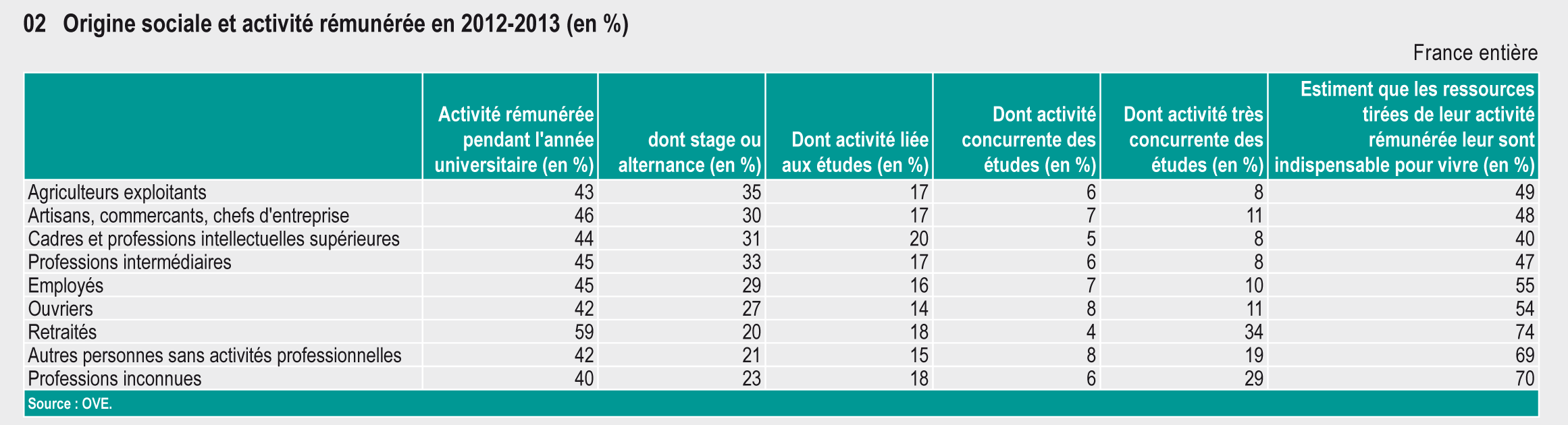 Professions des parents Activité rémunérée pendant l'année universitaire (en %) dont stage ou alternance (en %) dont activité liée aux études (en %) dont activité concurrente des études (en %) dont activité très concurrente des études (en %) Estiment que les ressources tirées de leur activité rémunérée leur sont indispensable pour vivre (en %)