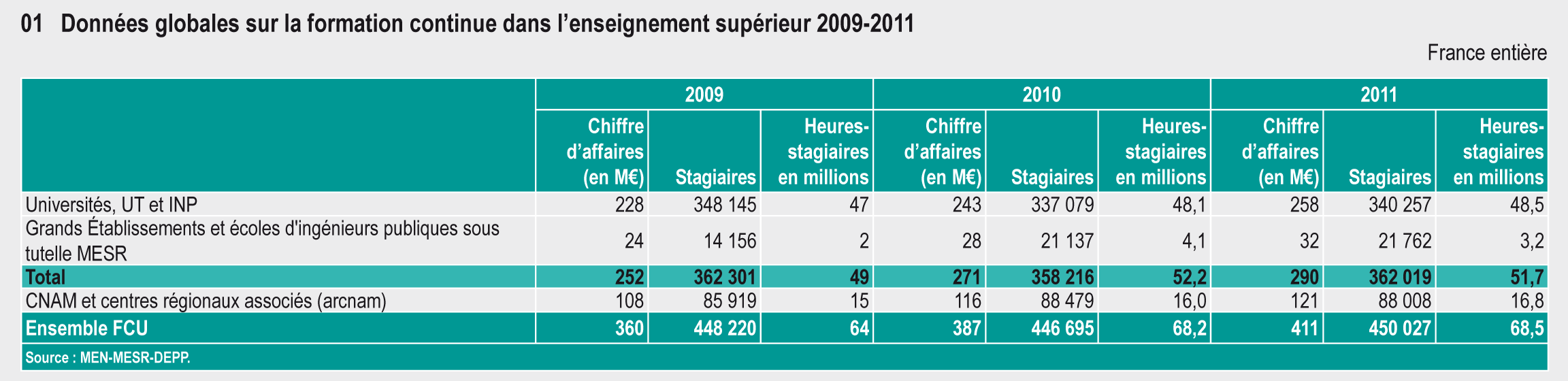 18.01 Données globales sur la formation continue dans l'enseignement supérieur de 2009 à 2011