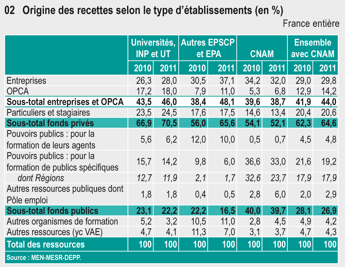 Les formations proposées par les universités progressent en chiffre d’affaires de 6 % et de 1 % pour le nombre de stagiaires et le volume d’heures-stagiaires. Le CNAM connaît une hausse de 5 % du nombre d’heures stagiaires pour un nombre inchangé d’auditeurs et pour un chiffre d’affaires qui augmente de 4 %. Après redressement, la durée moyenne des stages reste à 152 heures comme en 2010.