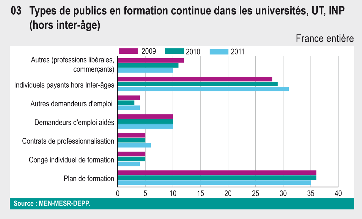 Cette fiche a été actualisée. Consultez la fiche 24. la formation continue dans l’enseignement supérieur dans L'état de l'Enseignement supérieur et de la Recherche en France n°10 - Avril 2017