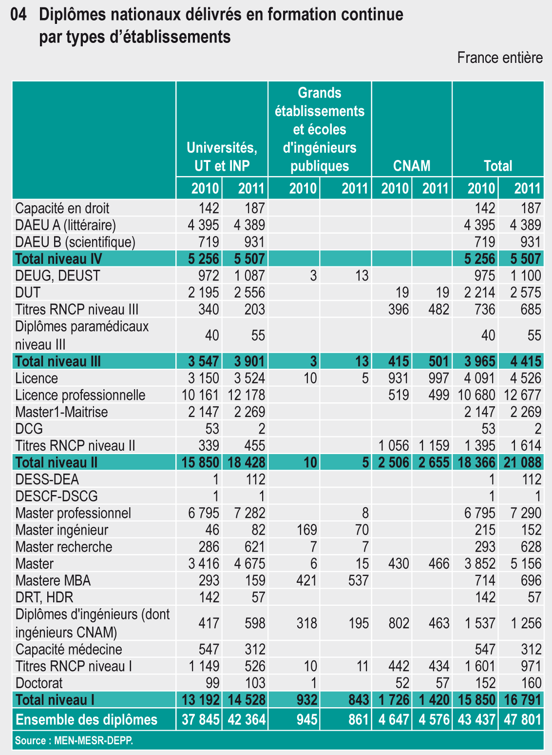 18.04 Diplômes nationaux délivrés en formation continue par types d'établissements