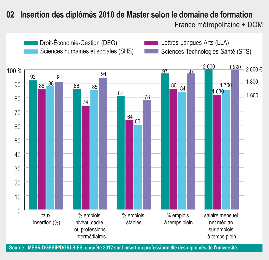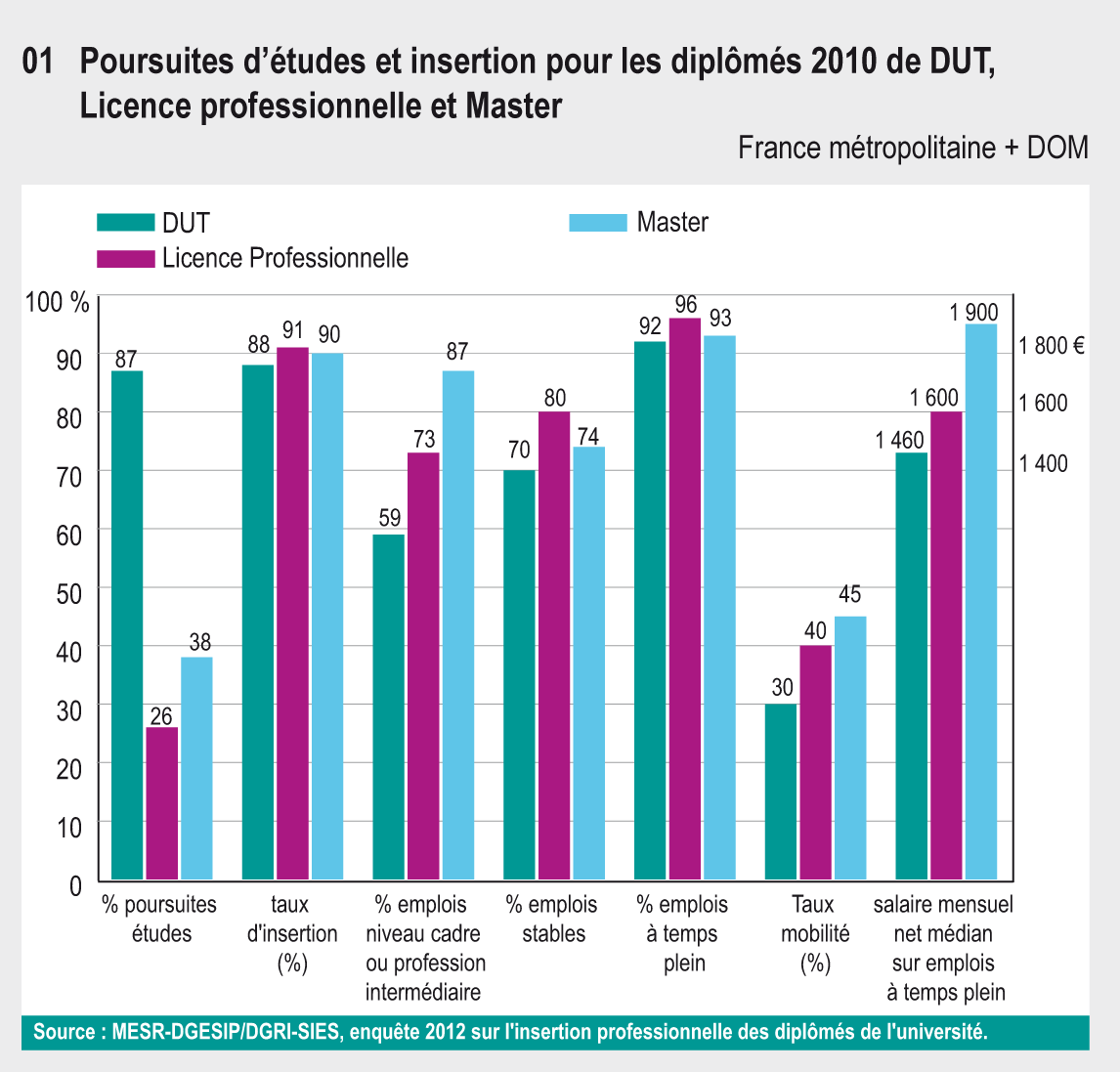 Près de 9 diplômés 2010 sur 10 de Master, Licence professionnelle et DUT sont en emploi en décembre 2012, 30 mois après leur entrée dans la vie active. Ce taux d’insertion est en recul d’un point par rapport à la précédente promotion pour ces diplômés confrontés à un contexte économique moins favorable. Les diplômés de Master ont bénéficié tout de même d’une forte augmentation des embauches dans l’enseignement public.