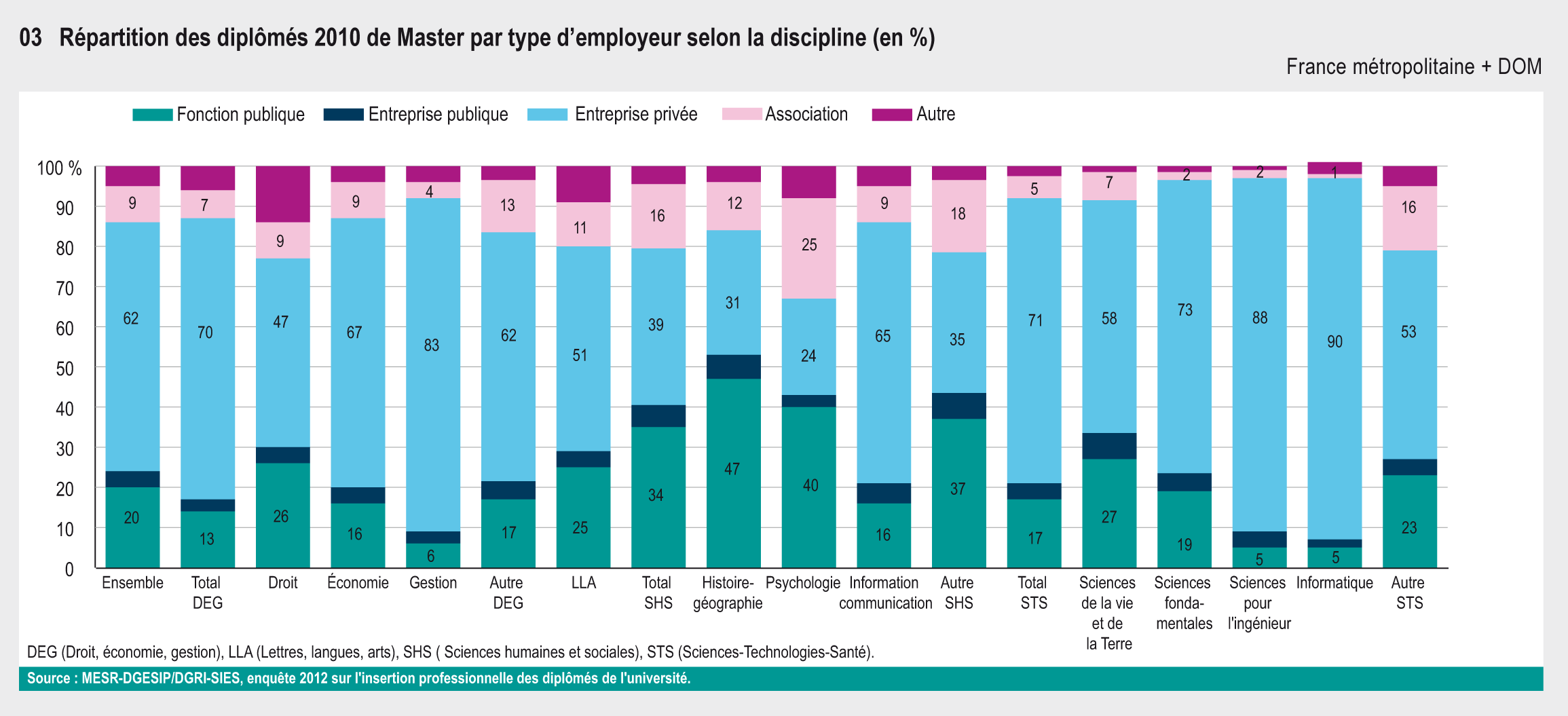 Six diplômés de master sur dix travaillent dans une entreprise privée, deux dans la fonction publique et un dans une association. L’évolution déjà perceptible l’année précédente se poursuit : les recrutements dans les entreprises privées diminuent (62 % pour les diplômés 2010 contre 63 % l’année précédente et 66 % deux ans auparavant) et ceux de la fonction publique augmentent (20 % pour les diplômés 2010 contre 18 % l’année précédente et 15 % deux ans auparavant), plus précisément dans l’enseignement public, qui a recruté 6 % des diplômés de Master 2010 contre 4 % de la promotion précédente. Ces recrutements supplémentaires concernent tous les domaines de formation sauf le DEG.