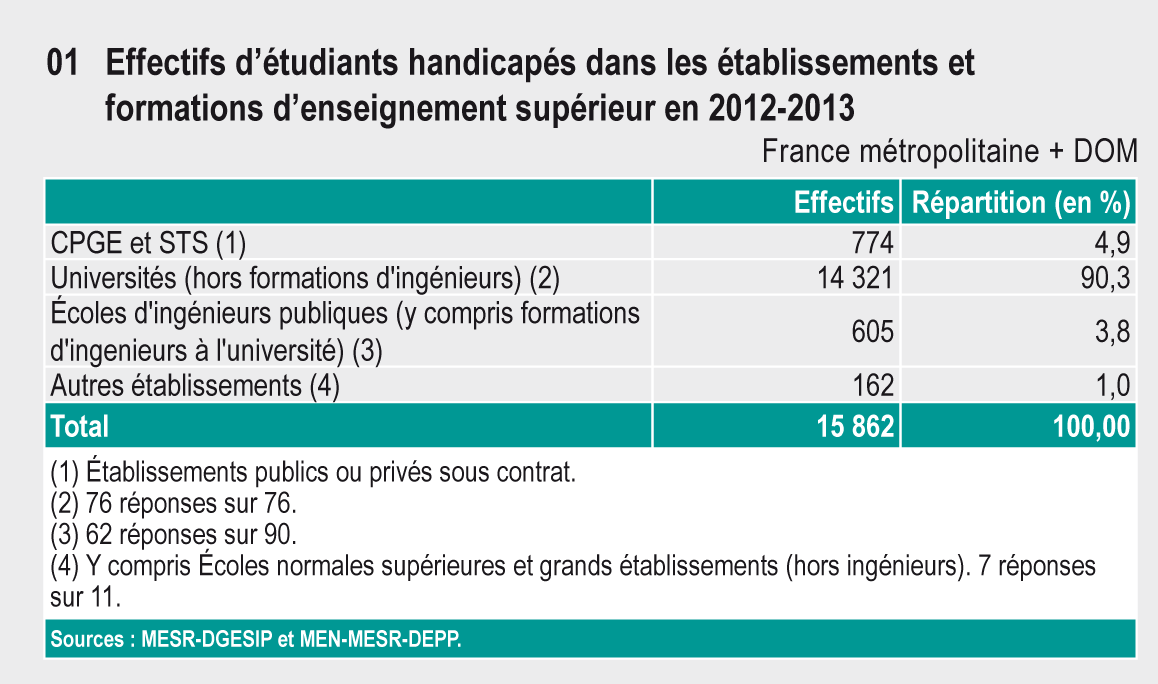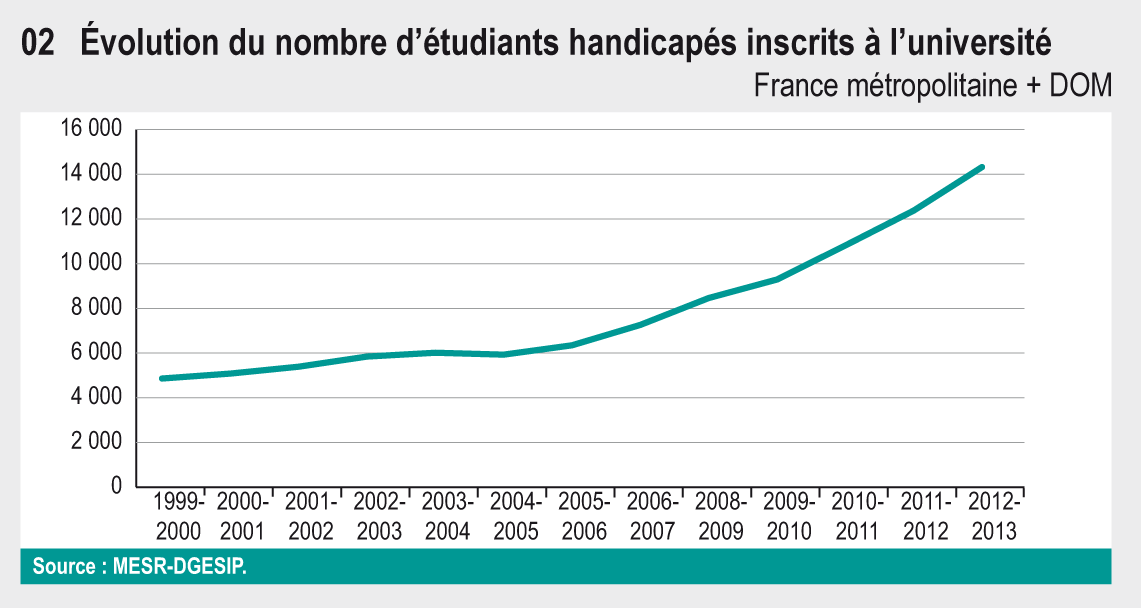 À la rentrée 2015, 23 257 étudiants des établissements d’enseignement supérieur publics se déclarent en situation de handicap soit 1,22 % de la population étudiante. Cet effectif a triplé depuis 2005. Parmi les étudiants en situation de handicap, 91 % sont inscrits à l’université, parmi lesquels 71 % bénéficient d’un plan d’accompagnement. Les aides sont plus nombreuses, diverses et mieux connues que par le passé, ce qui leur permet de ne pas rester à l’écart du mouvement général d’allongement des études. Si la progression dans leurs parcours reste différente de celle de la population, elle s’améliore très significativement depuis plusieurs années [Consulter cette page]