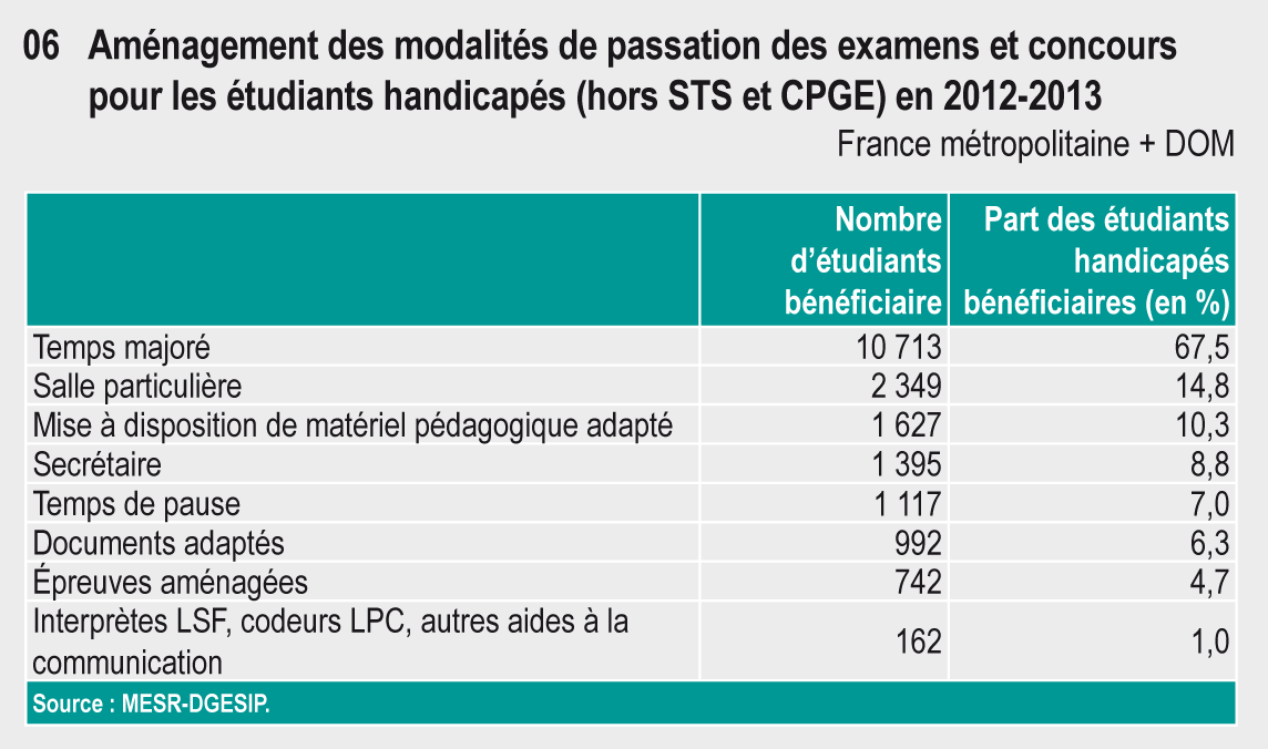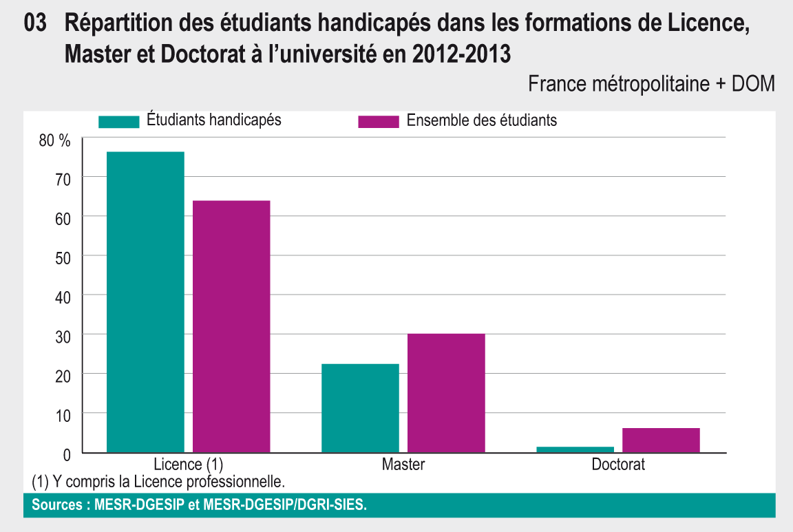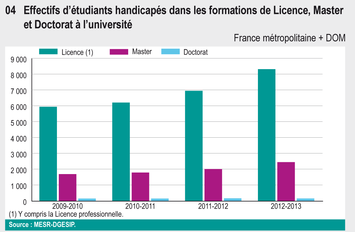 À la rentrée 2012, près de 15 900 étudiants des universités, STS et CPGE publics se déclarent handicapés et bénéficient d’une aide ou d’un suivi. 90 % d’entre eux sont inscrits à l’université. Leur nombre a doublé en 6 ans ; ils bénéficient en effet d’aides plus nombreuses et mieux connues qui leur permettent de ne pas rester à l’écart du mouvement général d’allongement des études. Néanmoins, ils se concentrent en Licence et leur présence décline au fil des cursus.