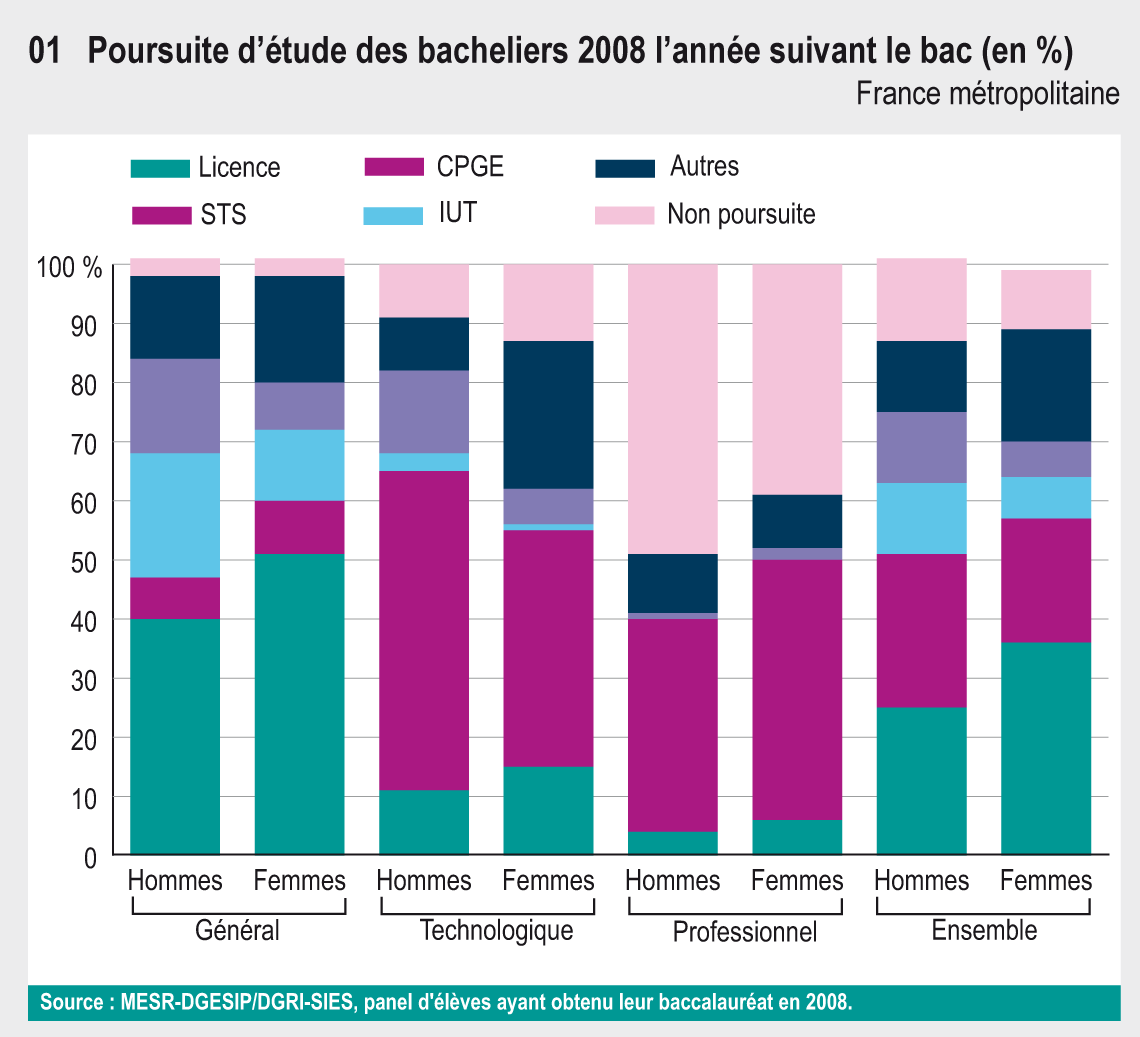 Ainsi, en 2008, 90 % des bachelières ont poursuivi leurs études après le bac contre 86 % des garçons. Elles n’ont pas choisi les mêmes filières : 36 % d’entre elles s’inscrivent en licence contre 25 % des garçons, et 8 % en PACES contre 6 % des garçons. À l’inverse, elles choisissent moins souvent des filières sélectives comme les CPGE (7 % contre 12 %), les IUT (6 % contre 12 %) ou les BTS (21 % contre 26 %). À l’université, elles s’inscrivent deux à trois fois plus souvent en lettres, arts, langues ou sciences humaines.