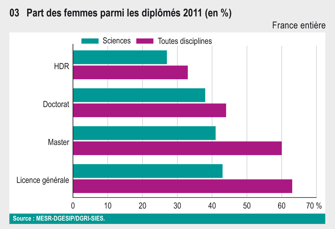 La mixité des formations de l’enseignement supérieur est par conséquent très variable : alors qu’en 2012- 2013 elles représentent 56 % des inscrits, les femmes sont à peine plus de la moitié en STS, 40 % en IUT, et 42 % en CPGE (graphique 24.02). Elles ne sont que 27 % à préparer un diplôme d’ingénieur (mais elles étaient 23,5 % en 2002-2003). À l’inverse, les formations paramédicales et sociales comprennent 84 % de femmes. À l’université, elles sont 70 % dans les filières lettres, sciences humaines mais seulement 37 % en sciences et STAPS. Alors qu’elles représentent 57 % des inscrits en cursus licence et en cursus master, elles ne sont plus que 48 % en doctorat (et moins d’un tiers des habilitations à diriger des recherches (HDR) délivrées en 2011) (graphique 24.03).