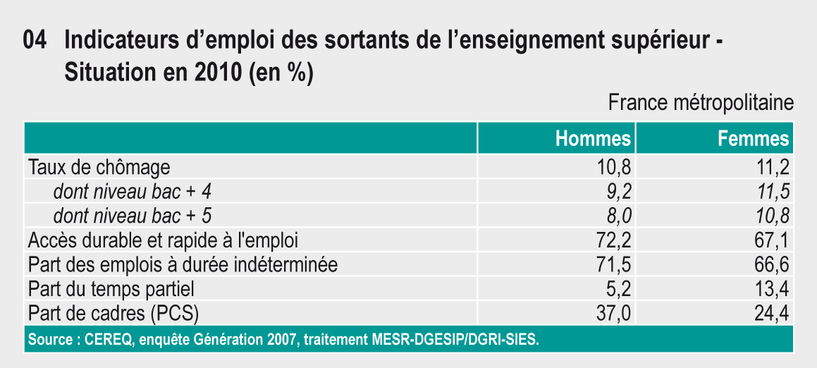 Les femmes, plus nombreuses que les hommes dans l’enseignement supérieur (55 %), s’inscrivent moins souvent dans les filières sélectives ou scientifiques et sont minoritaires en Doctorat. Leur taux de chômage en 2013, trois ans après leur sortie, est identique à celui des hommes, mais leurs conditions d’emploi sont moins favorables [Consult the following page]