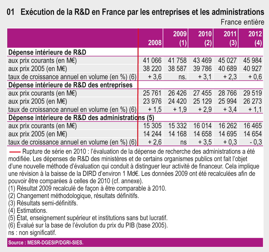 Rupture : en 2010 l’évaluation de la dépense de recherche des administrations a été modifiée. Les dépenses de R&D des ministères et de certains organismes publics ont fait l'objet d'une nouvelle méthode d'évaluation qui conduit à distinguer leur activité de financeur. Cela implique une révision à la baisse de la DIRD d'environ 1 Md€. Les données 2009 ont été recalculées afin de pouvoir être comparées à celles de 2010 (cf. annexe).
