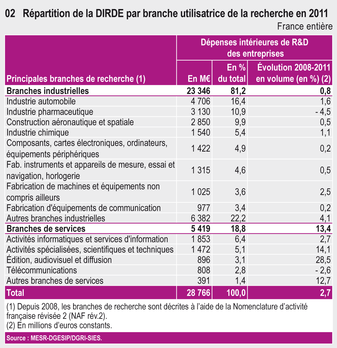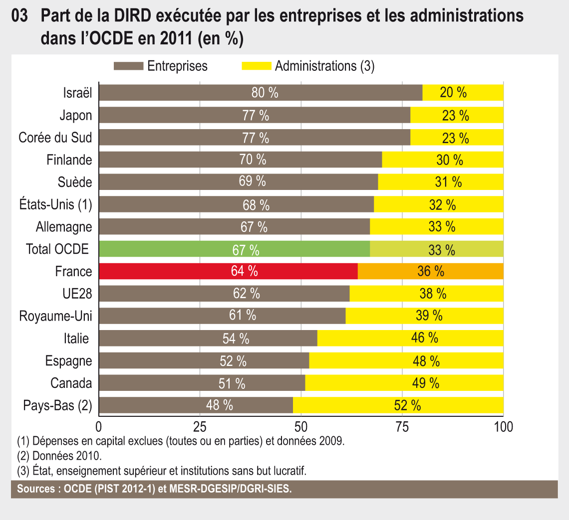 En 2011 six branches de recherche (Automobile, Pharmacie, Aéronautique, Composants électroniques, Chimie et Activités informatiques et service d’information) exécutent la moitié de la dépense intérieure de R&D des entreprises. Dans le secteur public, les organismes de recherche (EPST, EPIC) exécutent plus de 57 % de la dépense intérieure de R&D des administrations en 2011.
