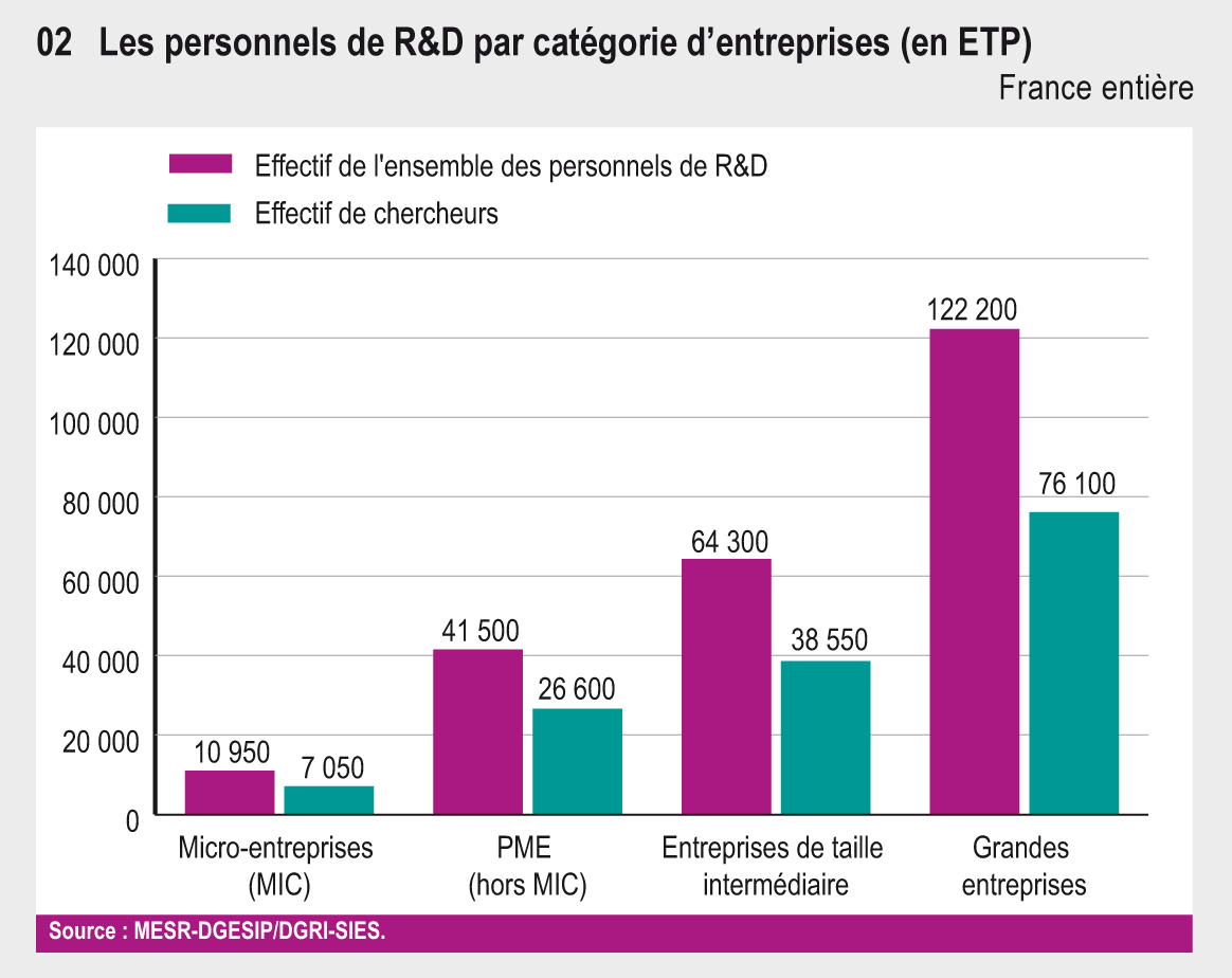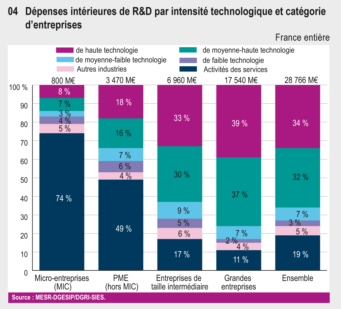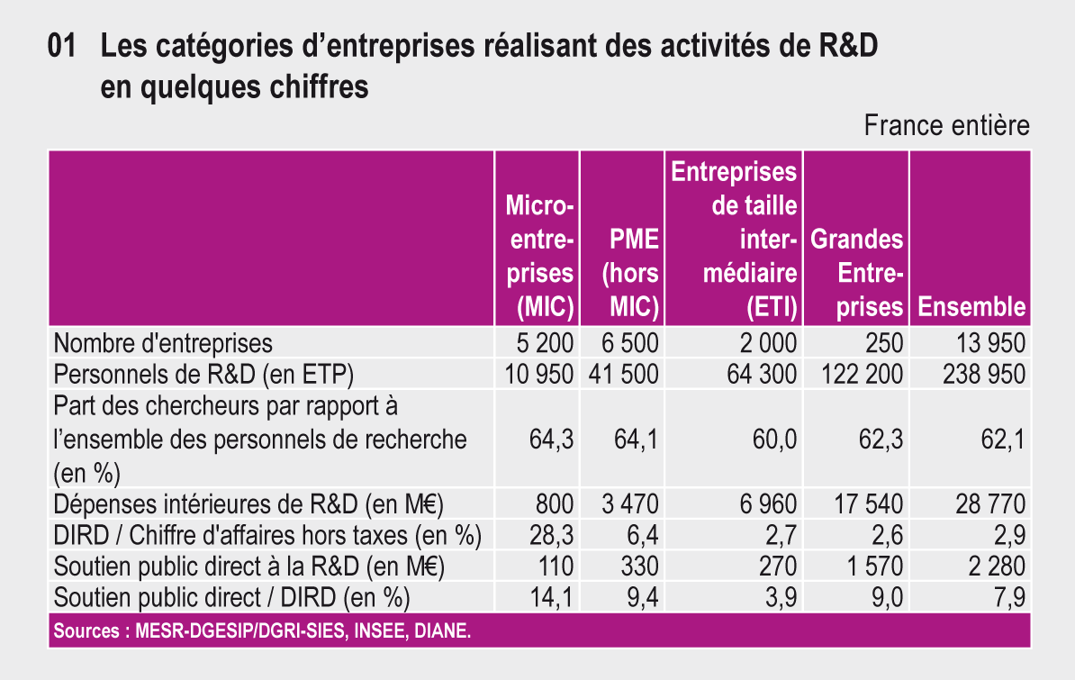 En 2011, les PME représentent 84 % des entreprises ayant réalisé des activités de R&D en France. Elles apportent 15 % des dépenses intérieures de R&D (DIRDE), dont plus de la moitié en faveur des activités de services. Les grandes entreprises, à l’origine de 61 % de la DIRD, réalisent les trois quarts de leur effort en haute et moyenne-haute technologie.