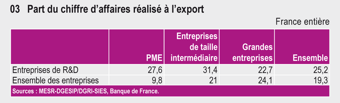 Les PME et les ETI actives en R&D exportent proportionnellement plus. Elles réalisent respectivement 37,3 % et 29,3 % de leur chiffre d’affaires à l’exportation contre 19,3 % en moyenne dans l’ensemble des entreprises (tableau 27.03).