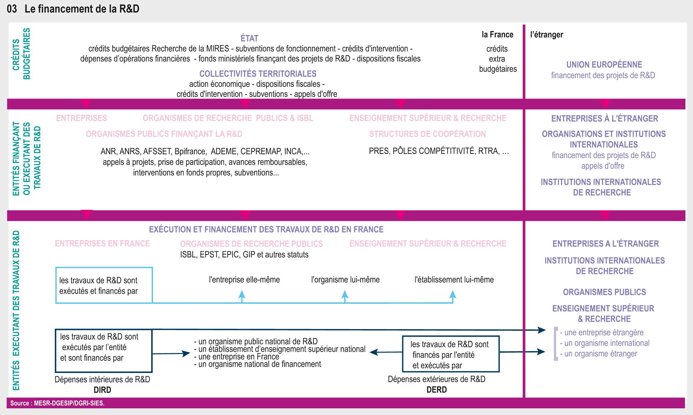 L’essentiel des moyens budgétaires de l’État consacrés à la R&D est regroupé au sein de la mission interministérielle de recherche et d’enseignement supérieur (MIRES). En 2012 et 2013, elle mobilise 14,1 Md€ . Les crédits budgétaires publics de R&D (CBPRD), qui comprennent notamment les crédits de la MIRES, couvrent la R&D exécutée dans les établissements publics, ainsi que dans les autres secteurs d’exécution en France et à l’étranger. Ils regroupent les subventions pour charge de service public et les crédits destinés à financer des programmes de recherche ciblés servis aux organismes publics de R&D, à la recherche universitaire, et aux agences de financement de projets de recherche, différents dispositifs d’aide et d’incitation à la R&D des entreprises et à la recherche partenariale public/privé. Ils concernent aussi le financement des mesures destinées à la diffusion de la culture scientifique et technique (schéma 33.03).