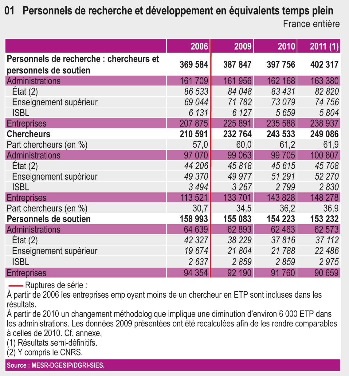 Ruptures : à partir de 2006 les entreprises employant moins de un chercheur en ETP sont incluses dans les résultats. A partir de 2010 un changement méthodologique implique une diminution d'environ 6 000 ETP dans les administrations. Les données 2009 présentées ont été recalculées afin de les rendre comparables à celles de 2010. Cf. annexe.