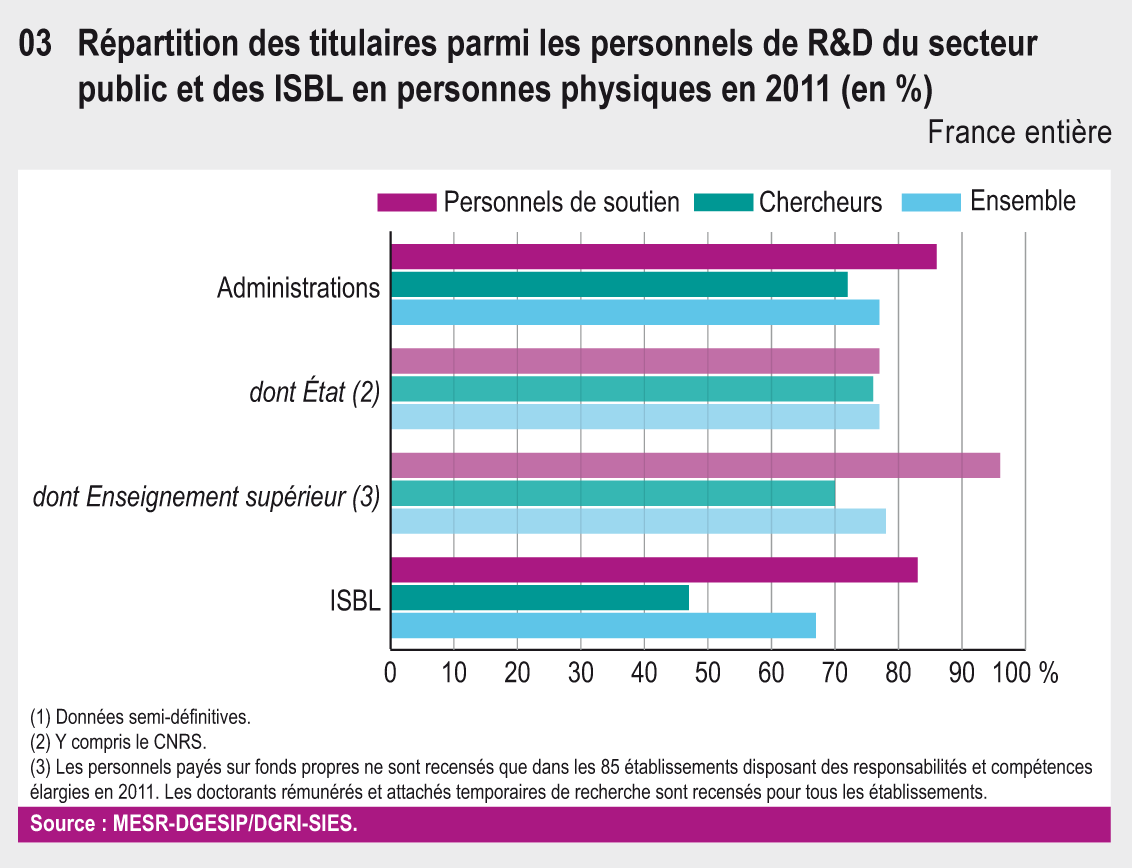PERRAIN Laurent, WOLBER Odile. Les moyens humains de la recherche et développement. In : État de l'Enseignement supérieur et de la Recherche en France - 47 indicateurs [en ligne]. LEFEBVRE Olivier (dir.). Paris : Ministère de l'Éducation nationale, de l'Enseignement supérieur et de la Recherche, 2014 (7e éd.), fiche 34, p. 78-79 [Consulté le 25/01/2026]. ISBN 978-2-11-099379-3. Disponible à l'adresse : https://publication.enseignementsup-recherche.gouv.fr/eesr/7/EESR7_R_34-les_moyens_humains_de_la_recherche_et_developpement.php
