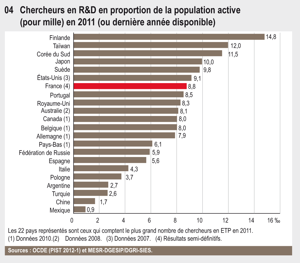 Si l’on rapporte le nombre de chercheurs à la population active, la France, avec 8,8 chercheurs pour mille actifs en 2011, se place derrière le Japon et les États-Unis, mais devant l’Allemagne et le Royaume-Uni (graphique 34.04). Plusieurs pays moins peuplés se situent aux premiers rangs mondiaux, notamment la Finlande, Taïwan et la Suède