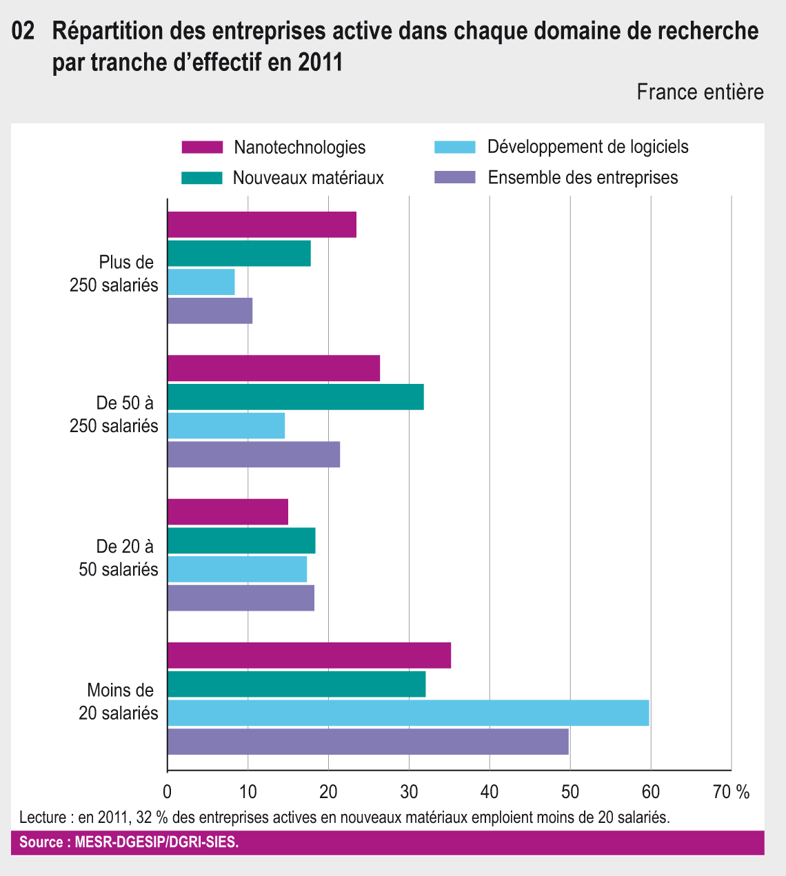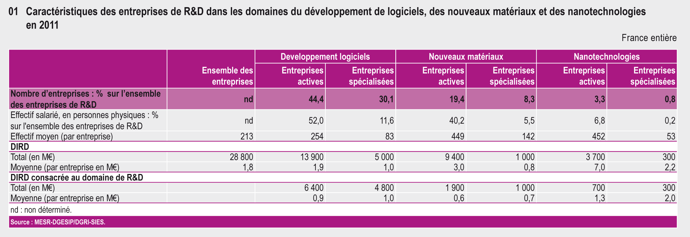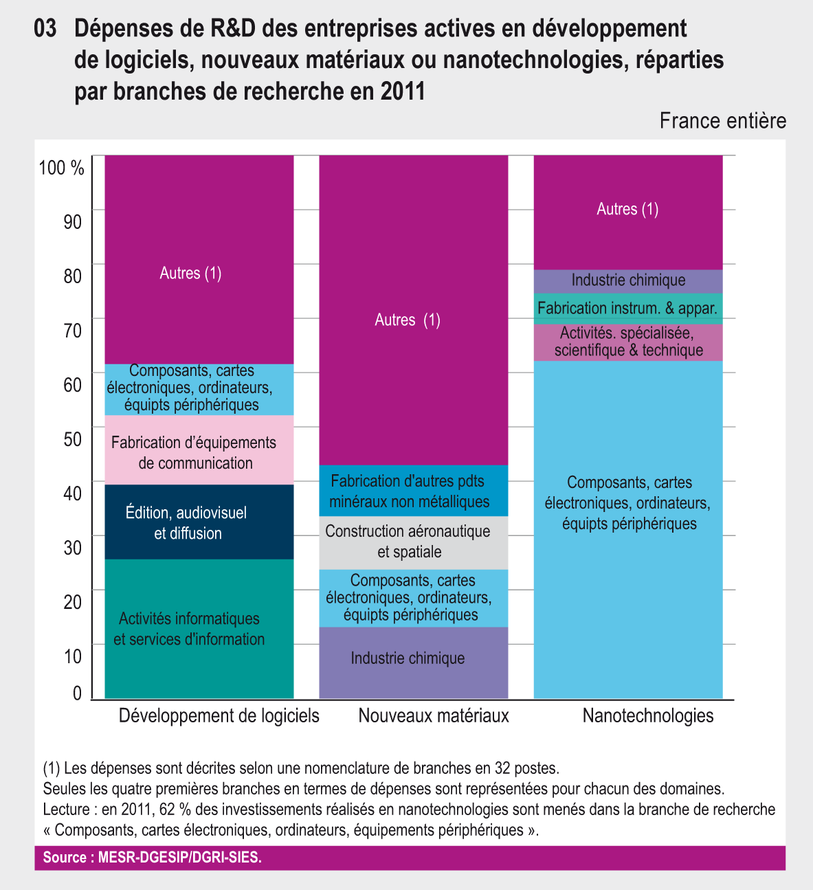 En 2011, 61 % des entreprises ayant une activité interne de R&D en France consacrent une partie de leurs travaux de R&D au développement de logiciels, aux nouveaux matériaux ou aux nanotechnologies.