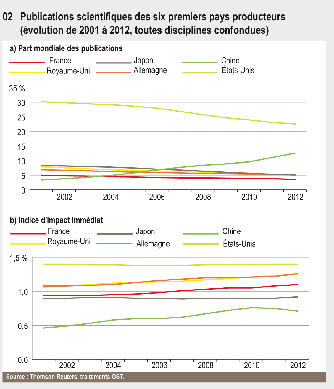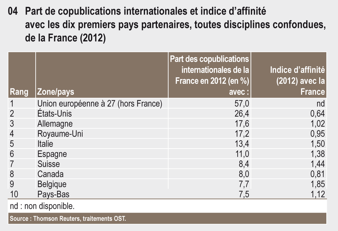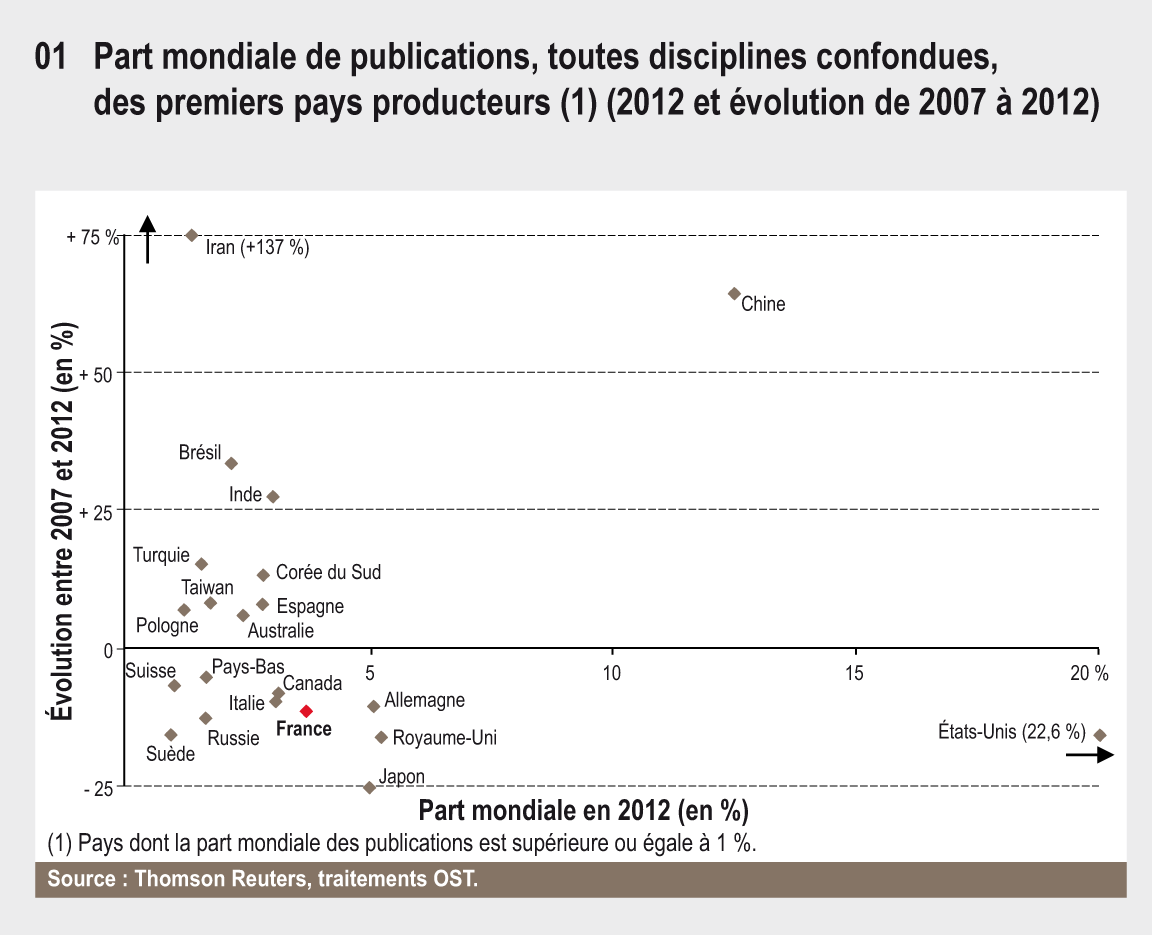 La France se situe au 6e rang mondial en 2012 avec 3,6 % des publications scientifiques mondiales. L’évolution de son positionnement est comparable à celle de ses grands homologues européens : part de publications en baisse, indice d’impact en augmentation et supérieur à la moyenne mondiale. L’Union européenne et les États-Unis sont ses premiers partenaires scientifiques.