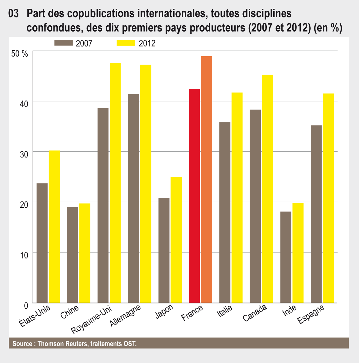 45.03 Part des copublications internationales, toutes disciplines confondues, des dix premiers pays producteurs (2007 et 2012)