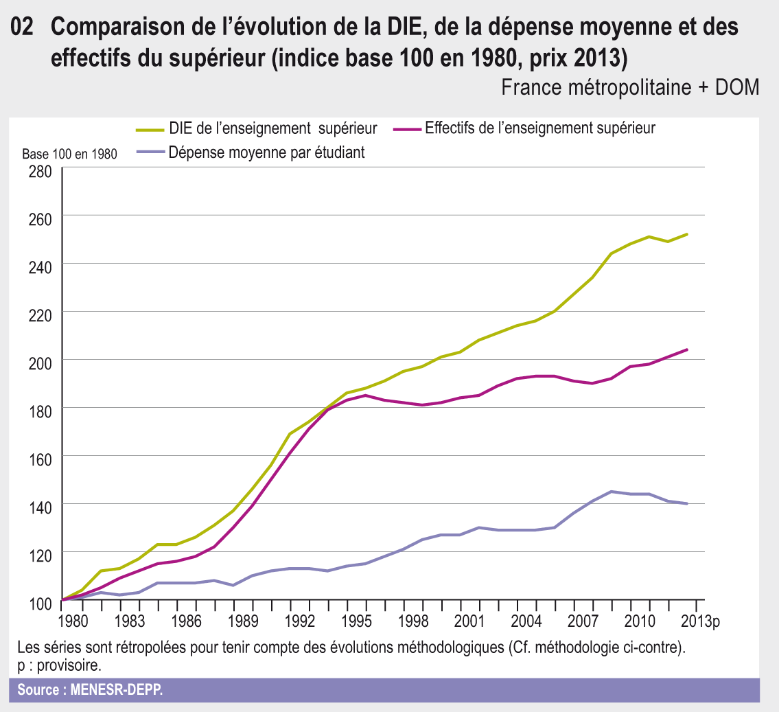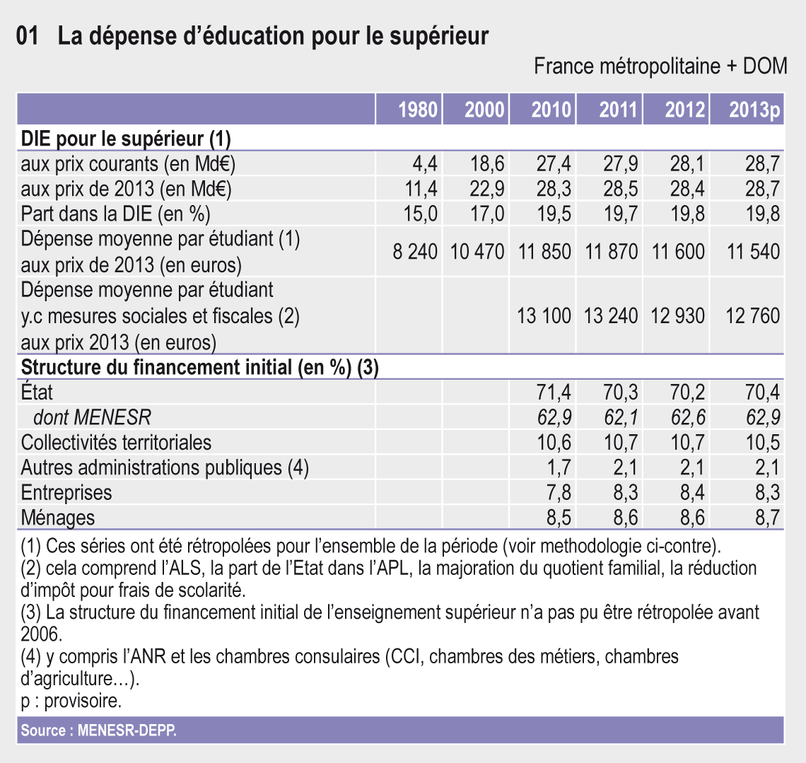 En 2013, la collectivité nationale (État, collectivités territoriales, autres administrations publiques, ménages et entreprises) a consacré 28,7 milliards d’euros à l’enseignement supérieur, soit une augmentation de 1,2 % par rapport à 2012 (en prix constants). Depuis 1980, la dépense pour l’enseignement supérieur a connu une forte croissance, de 2,8 % en moyenne annuelle. Son poids dans la dépense intérieure d’éducation (DIE) est passé de 15,0 % en 1980 à 19,8 % en 2013 (tableau 01.01).