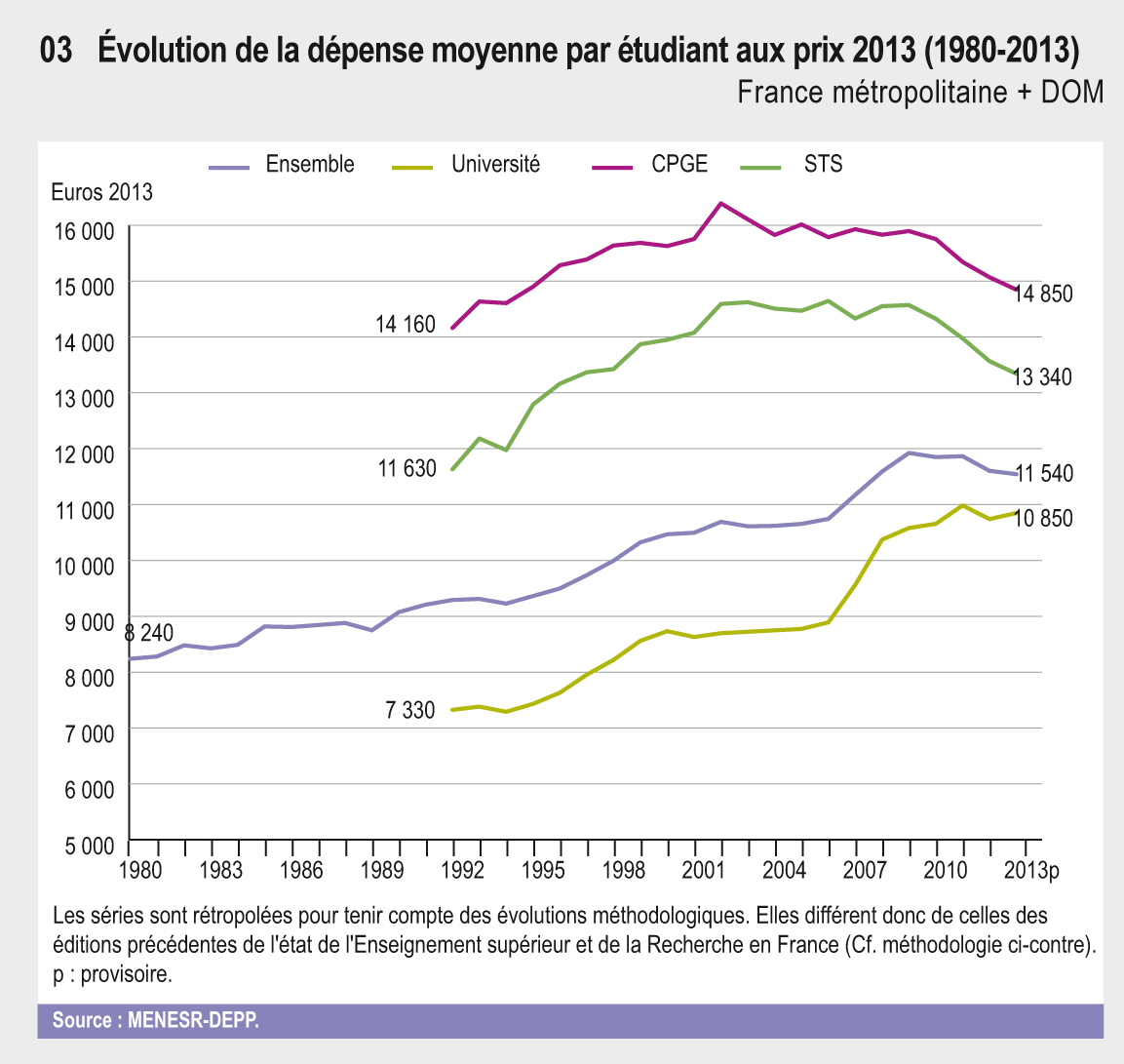 La dépense moyenne par étudiant atteint 11 540 euros en 2013 graphique 01.03). Si la comparaison directe du coût des formations est délicate, notamment en raison de l’intégration des dépenses liées à la recherche dans les universités, on constate des différences sensibles selon les filières de formation. Le coût varie de 10 850 euros par an pour un étudiant d’université jusqu’à 14 850 euros pour un élève de CPGE. Néanmoins, au cours des années récentes, ces dépenses moyennes ont tendance à se rapprocher (graphique 01.03).